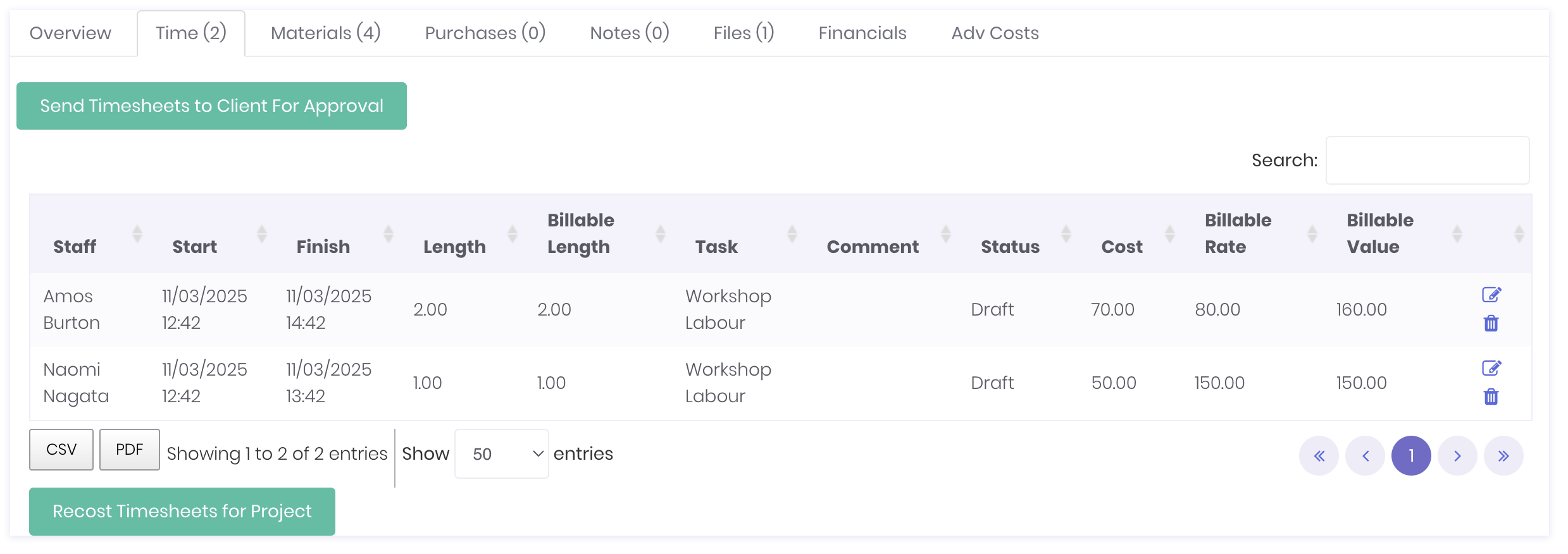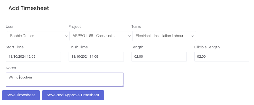 Once you have entered all of these fields, click Save Timesheet to complete the timesheet entry. Timesheets are now available to be managed in the timesheet dashboard and the project's Time tab.