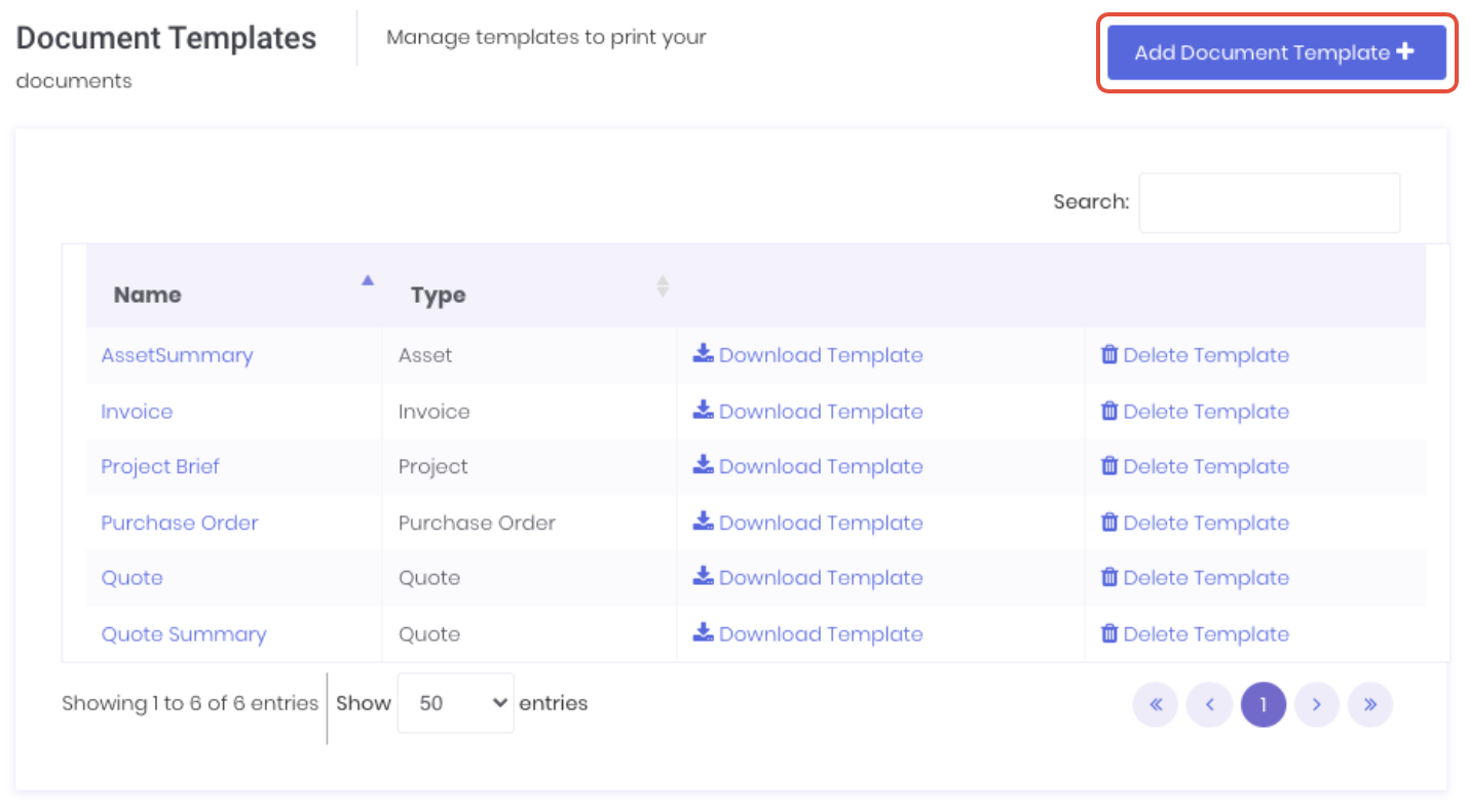 New document templates can be added to WorkGuru from the Add Document Template button on the top right of the document template dashboard. You can edit an example template, or create your own from scratch using our mergefield library. Ensure that your document templates meet the requirements to print correctly.