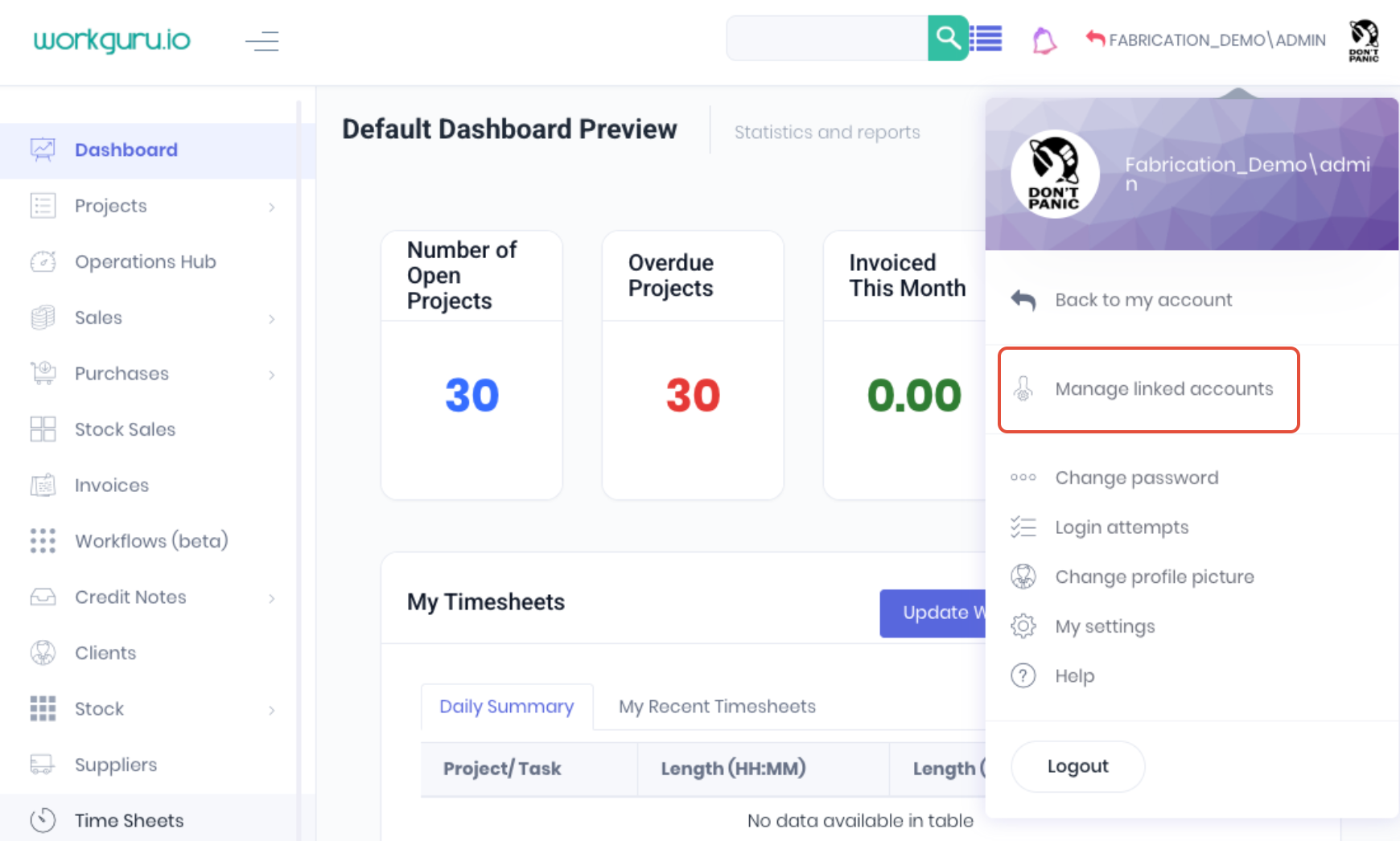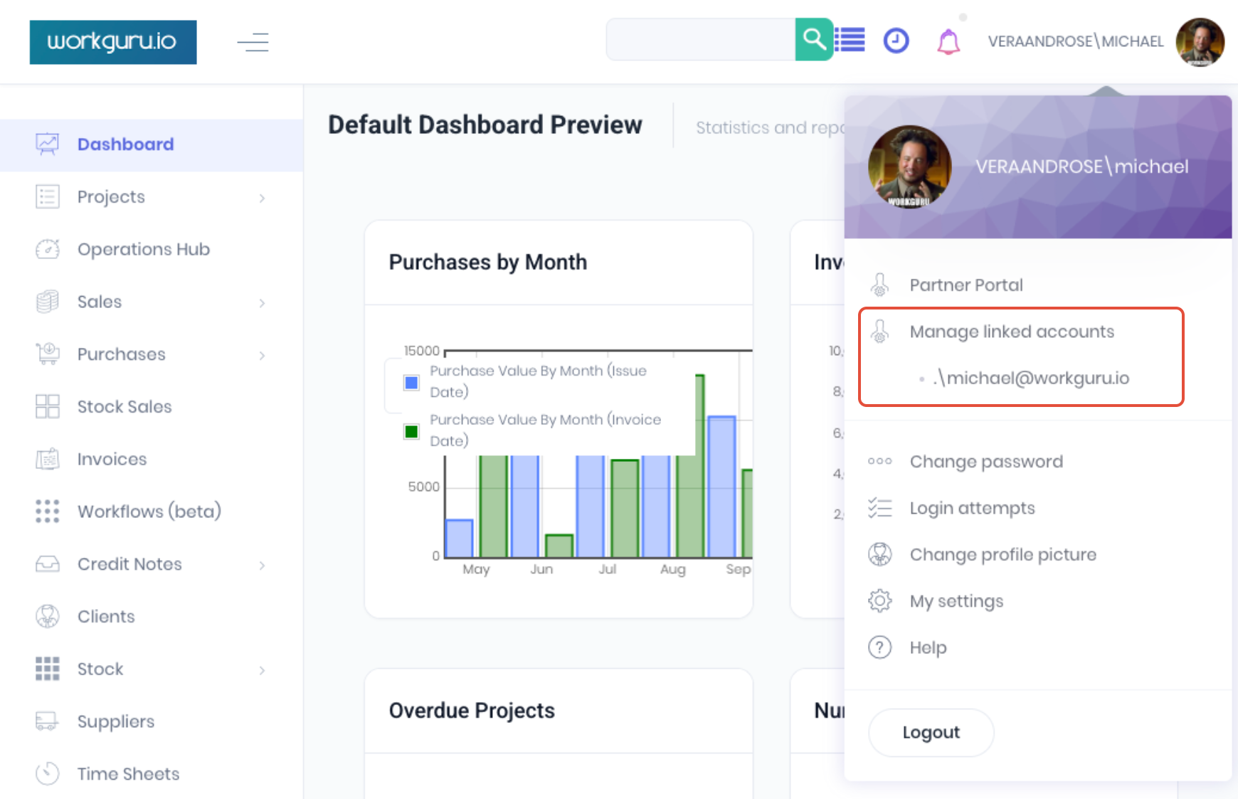 You can then switch between WorkGuru tenants without having to enter credentials from the my account menu by clicking on the required tenant listed under the linked accounts.