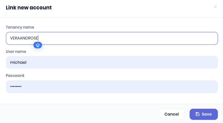 The window will prompt for the tenant name and your credentials. These are the same details you would use to log into the tenant directly. Click Save when entered.