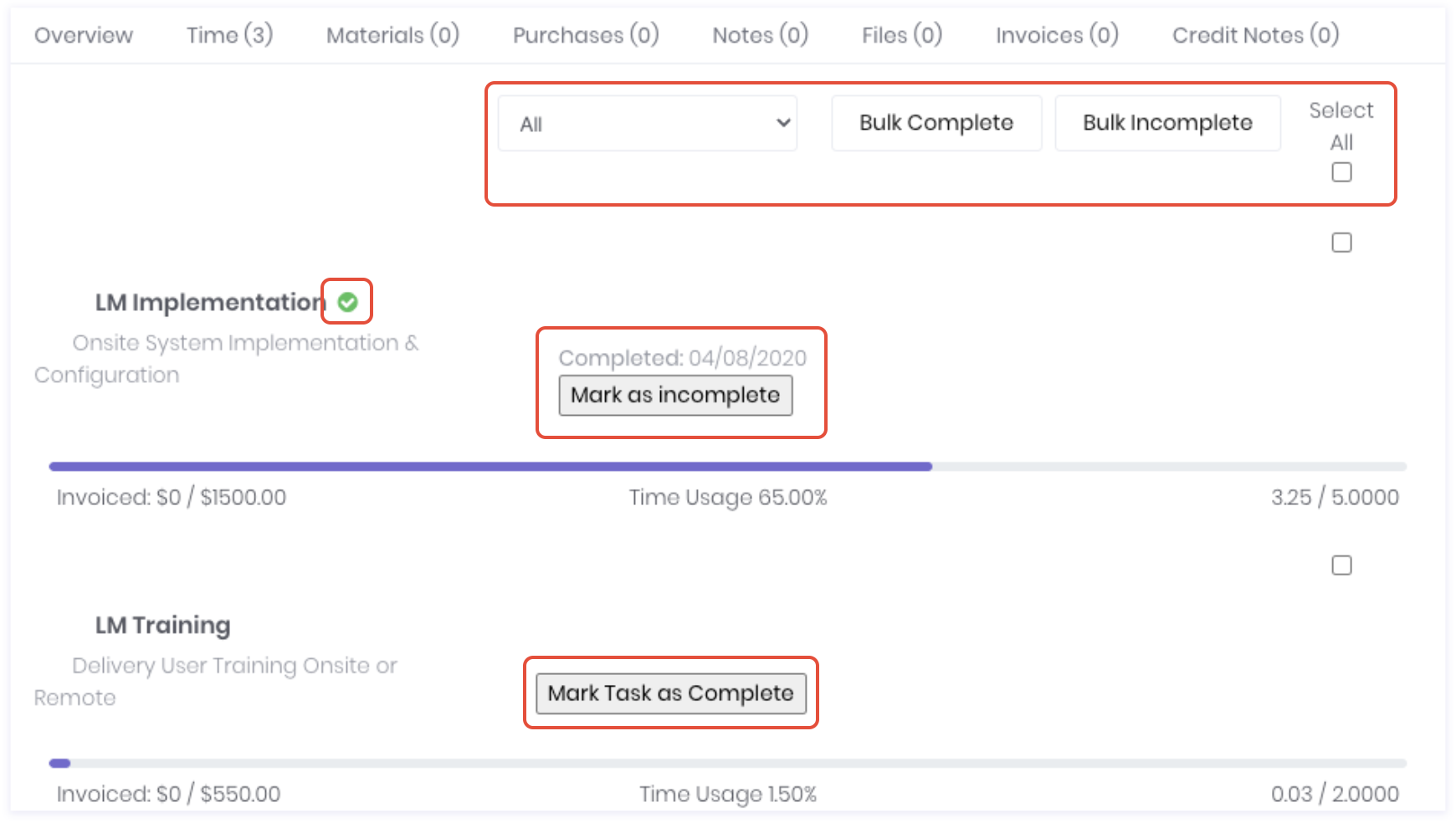 In the project, ensure that the relevant tasks have been marked complete. You can do this from the overview tab in the project's detail page by clicking the Mark Task as Complete. The task will then be timestamped with the completion date. You can use the Bulk Complete and Bulk Incomplete buttons with their corresponding check boxes to process multiple tasks at once. Use the dropdown to show or hide completed tasks.