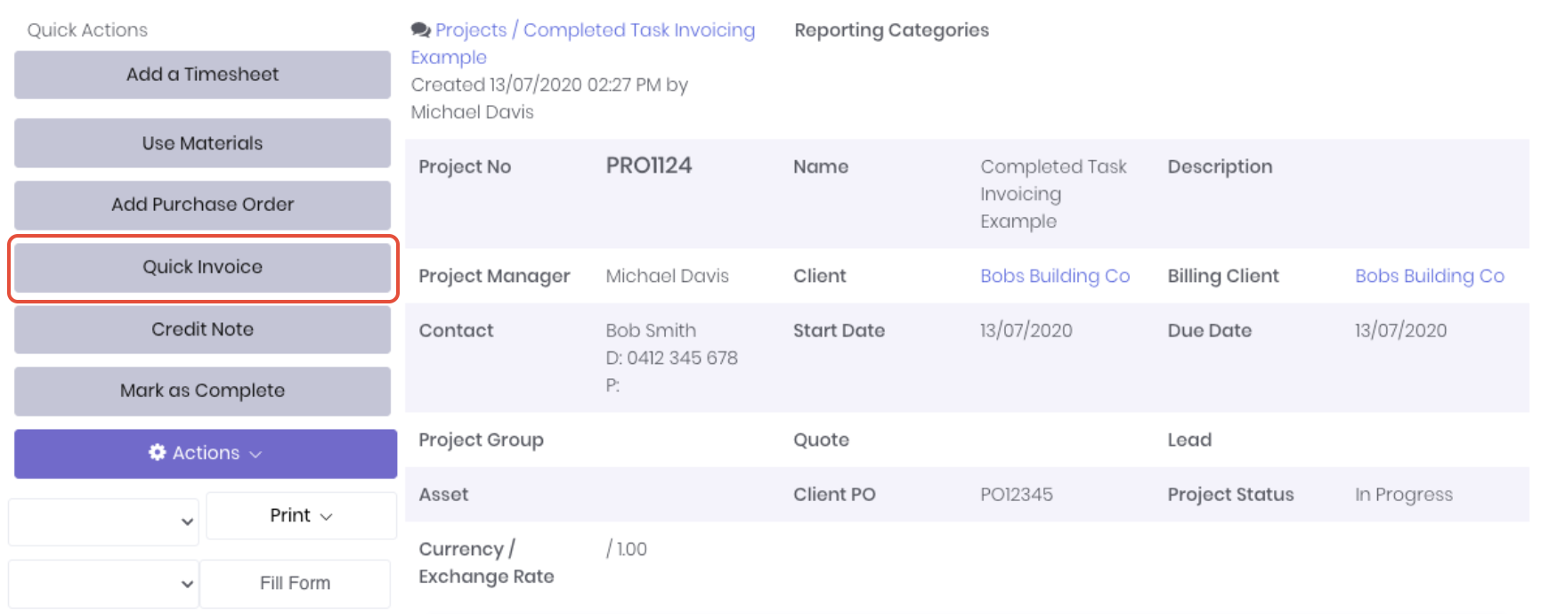 From the project's Quick Actions menu, click on Quick Invoice.