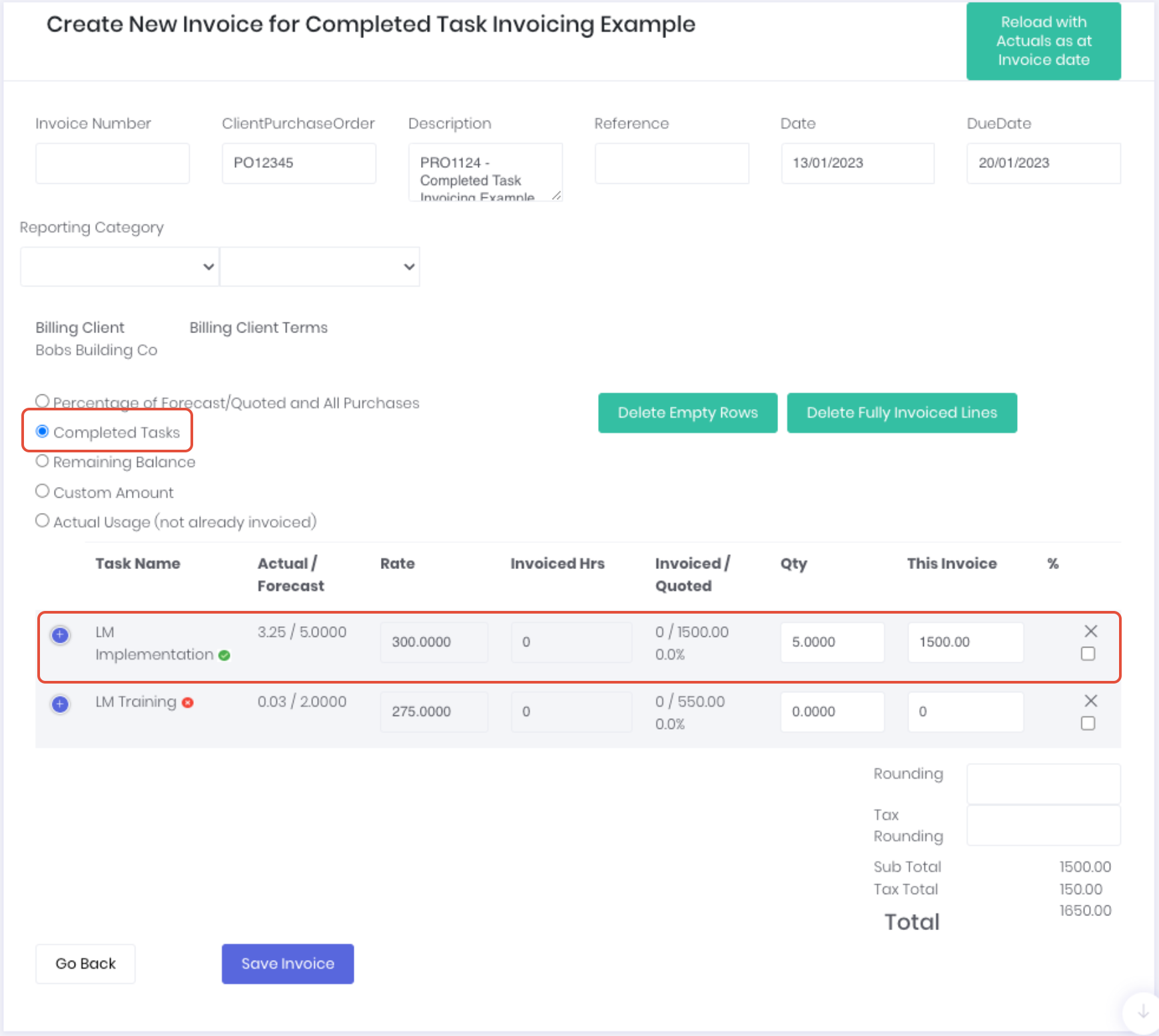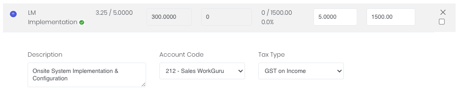 - Invoice type - Completed Tasks - WorkGuru will indicate the completed tasks with a green tick next to the task name. When the completed tasks invoice type is selected, WorkGuru will invoice 100% of the completed task's forecast value. Incomplete tasks will remain on the invoice for $0 unless removed from the quote invoice screen clicking the "X" on the end of the row, or in bulk by clicking the Delete Empty Rows button. Note: removing a task does not remove it or it's actuals from the project, just from this invoice