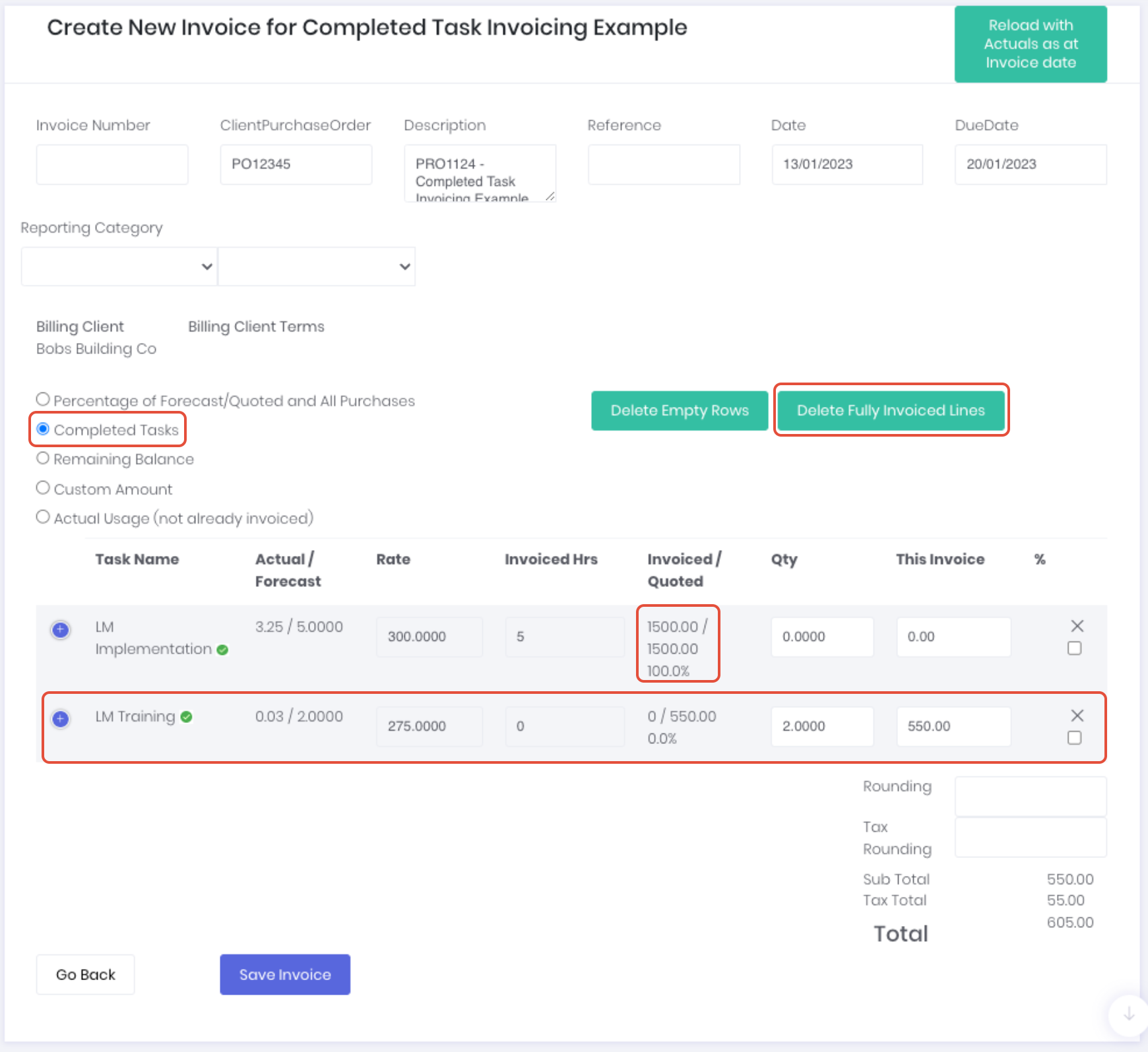 When invoicing remaining tasks as they are completed, WorkGuru tracks what has been invoiced to date, so the following invoices will only prompt to invoice tasks completed since the last invoice. If you only want to display the completed tasks on this invoice, click Delete Fully Invoiced Lines to quickly remove the completed and invoiced tasks from this invoice.