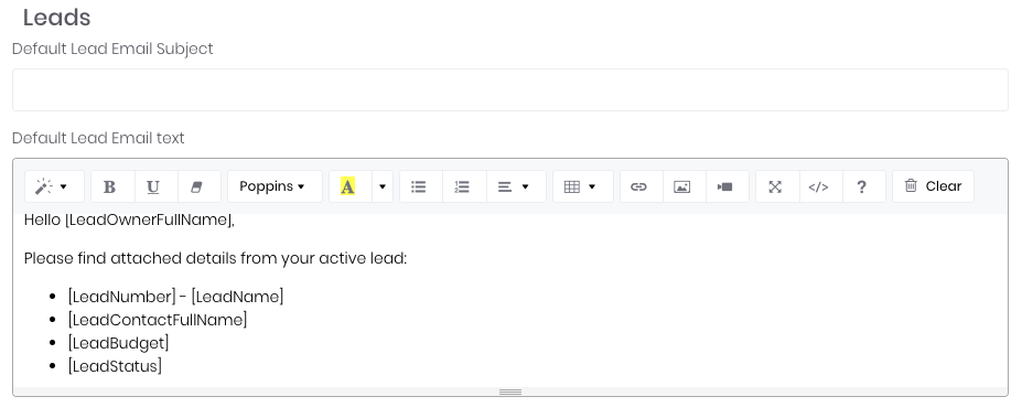 • Default Lead Email Text - Enter email body text.  Email template merge fields can be used.