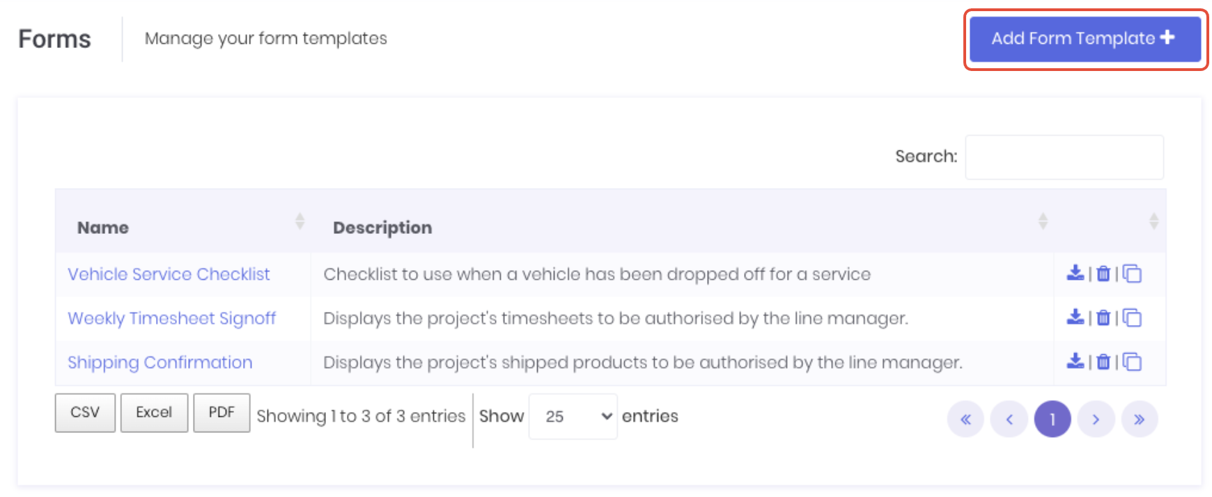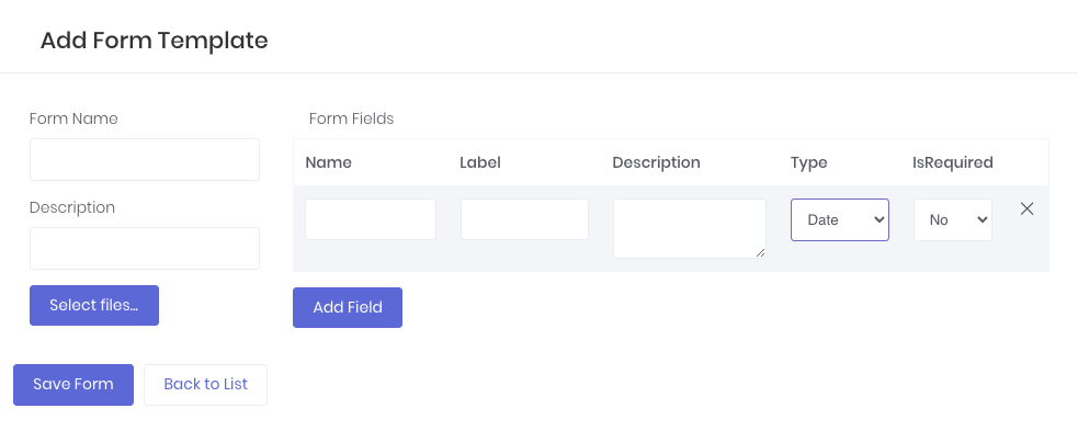 To add the form and define the form fields, click Add Form Template from the forms dashboard.