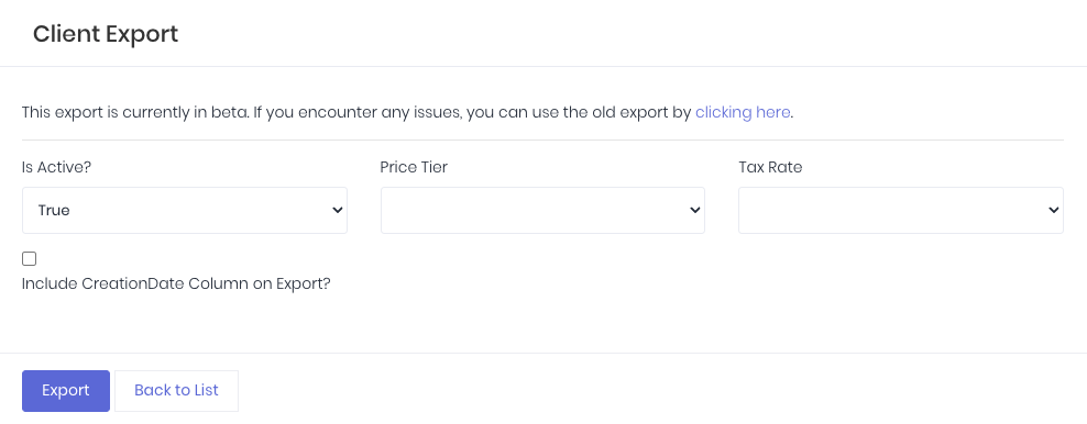 Select the relevant options to refine the export, for example, just export currently active clients and click Export to download the export csv.