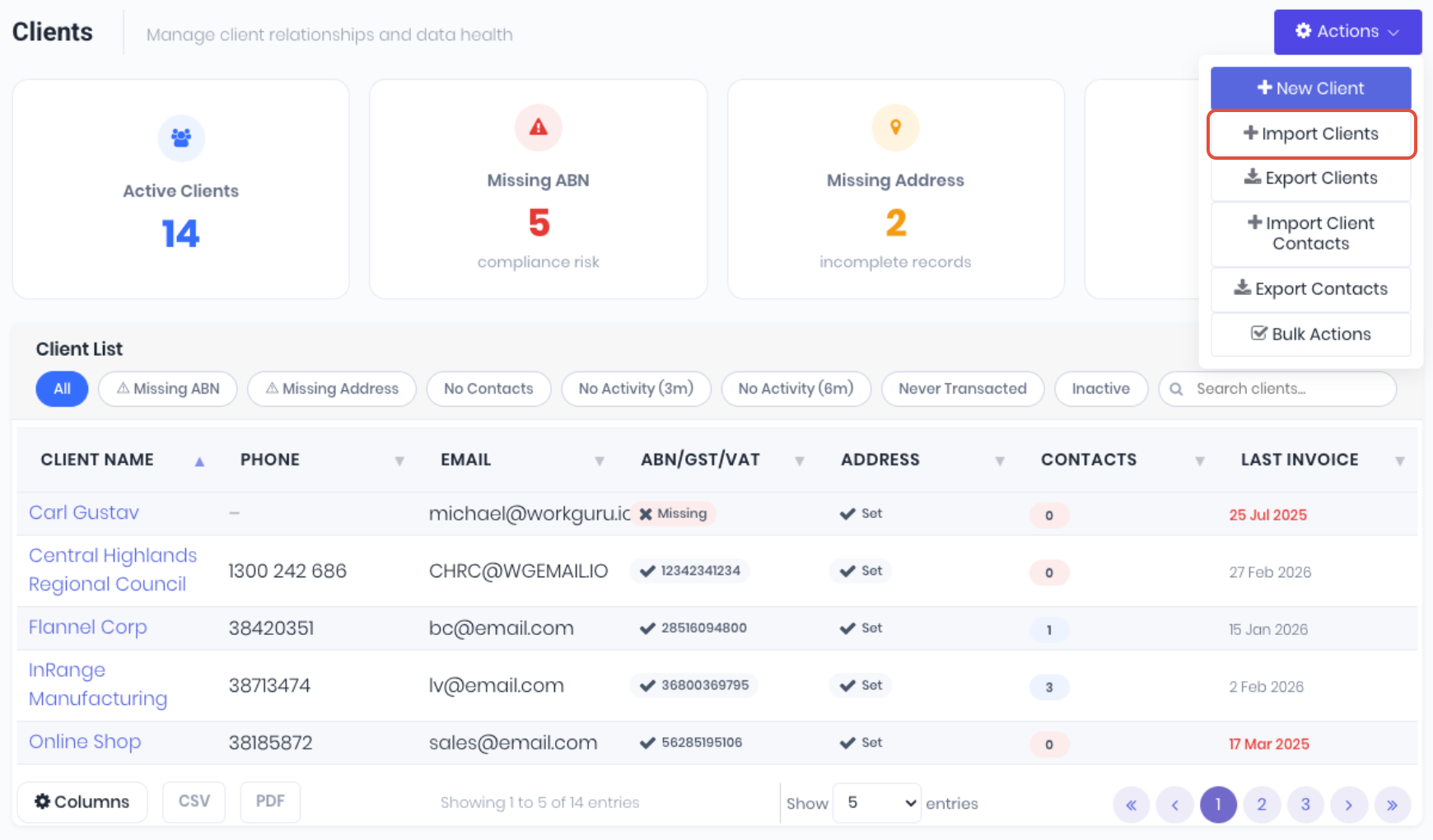When updating clients in bulk, the import is matched on the client name. You can use a new import of new or updated client details, or another option is to export your existing client list to a spreadsheet to update. You can update your current client list by selecting Export Clients from the Actions menu on the client dashboard: