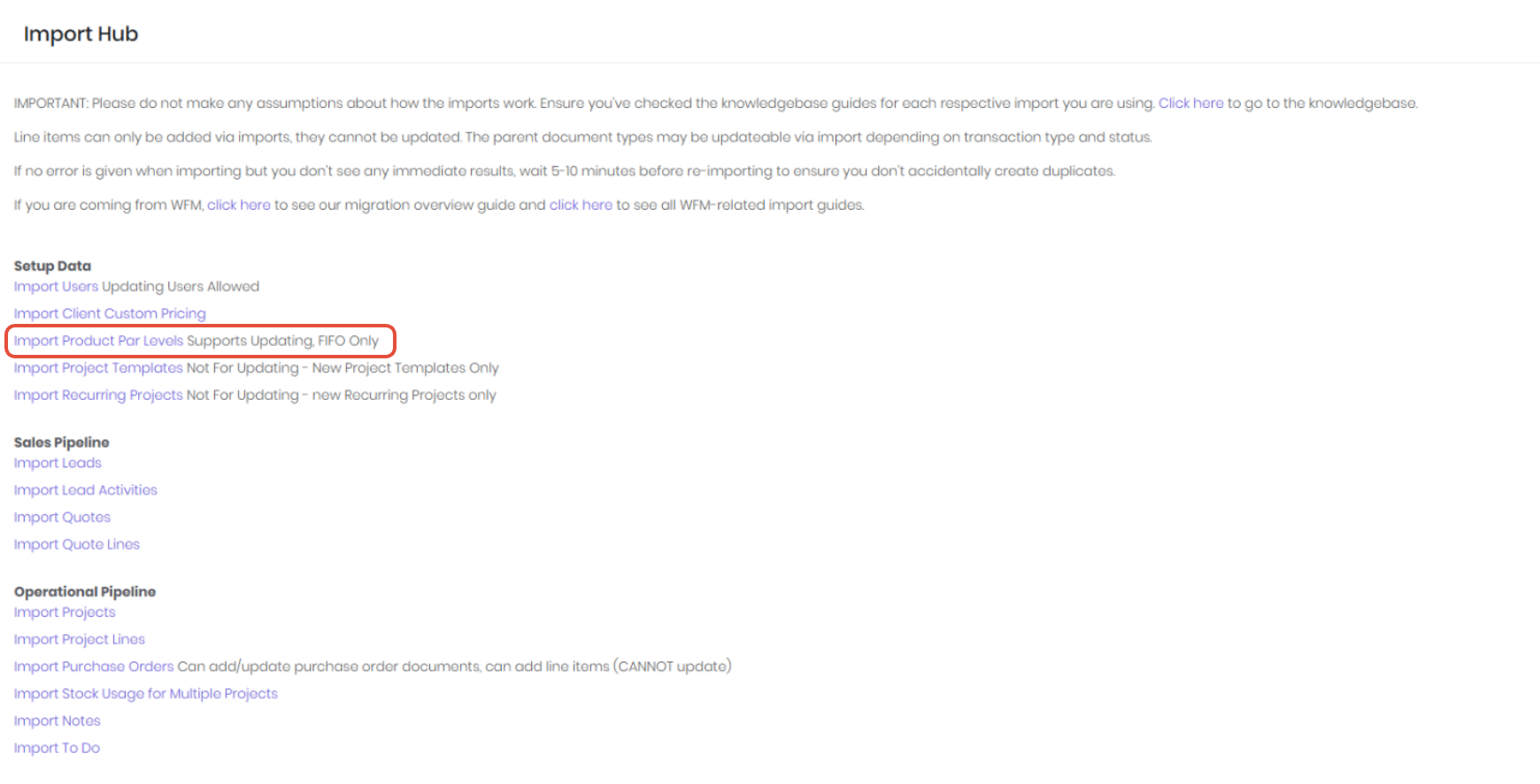 Product Par levels and locations can be imported and updated in bulk via the attached template. Note: this import will only work for FIFO products. Product Par Levels and Locations are not part of the standard product import template. The products you are adding levels and locations to must have already been created/imported in WorkGuru. The import template can be uploaded on the Import Hub (Administration -> Imports)