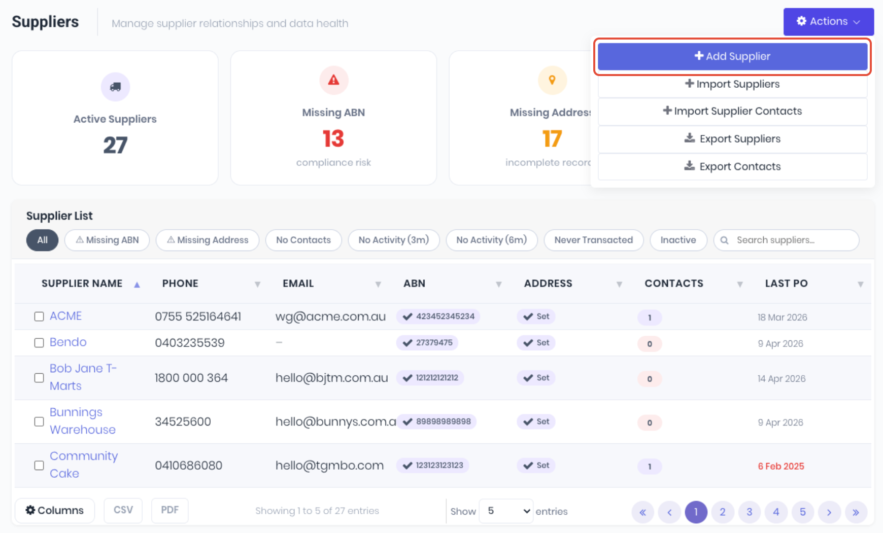 You can add suppliers directly to WorkGuru by clicking on Add Supplier in the Actions menu from the supplier dashboard.
