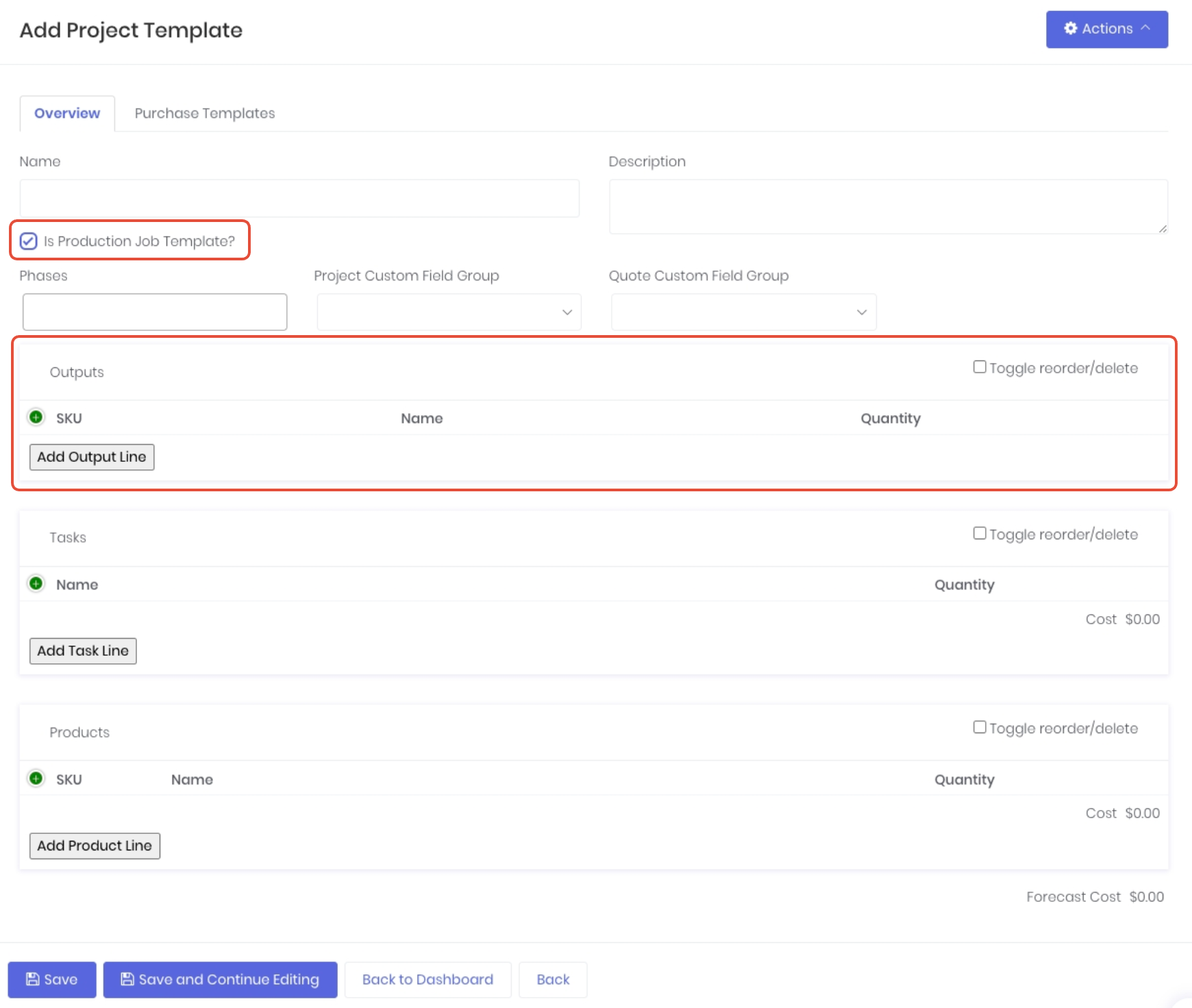 - Is Production Job Template: Ensure this is selected as this enables the output lines required for a production template.