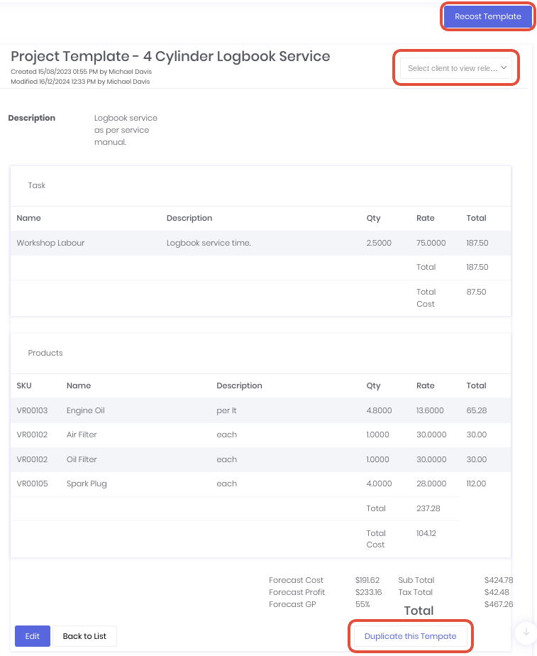 From the details page you can review the templates line items, custom fields (if enabled) and the template's forecast profitability. Additional functions include: