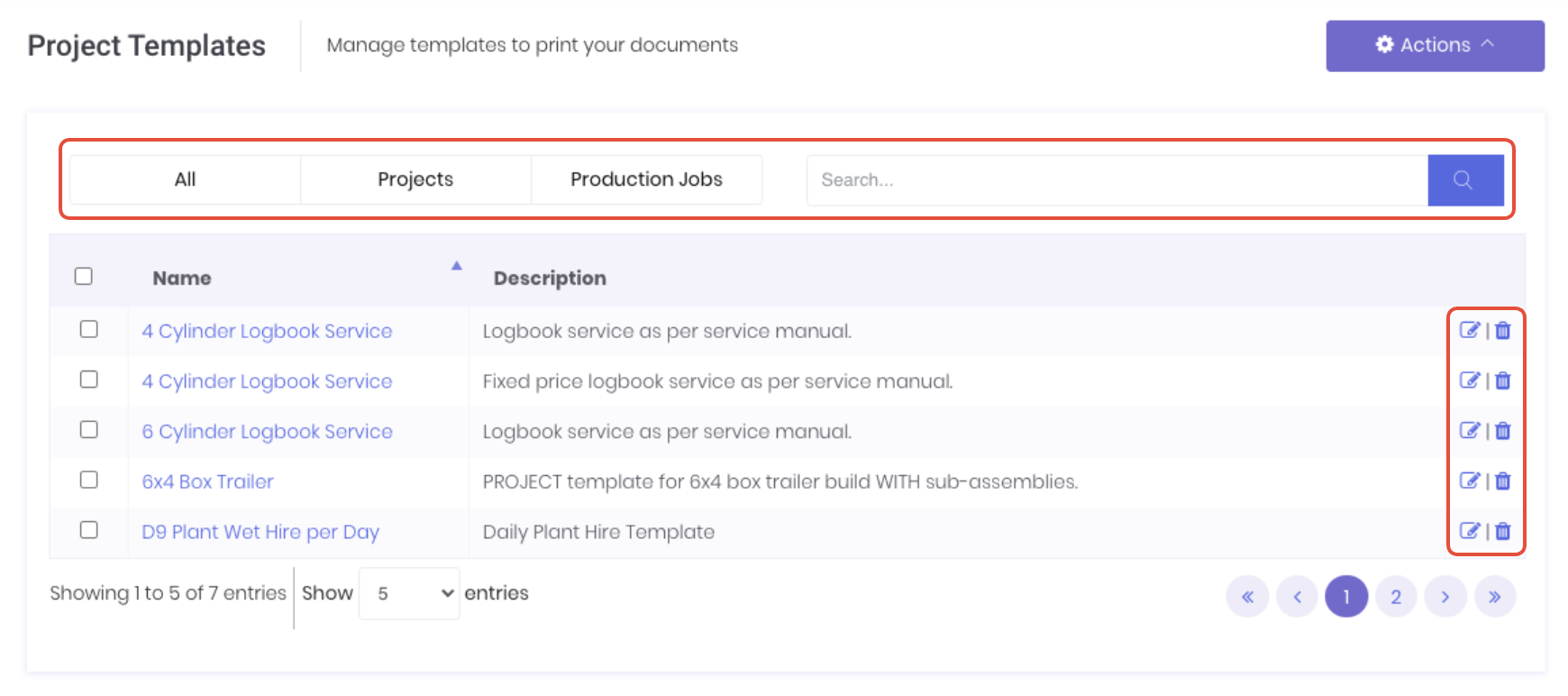 Template management is done from the project templates dashboard. From the dashboard you can Search templates and/or refine the list via the All, Projects and Production Jobs tabs. For each template, there are shortcuts to edit or delete the temple.