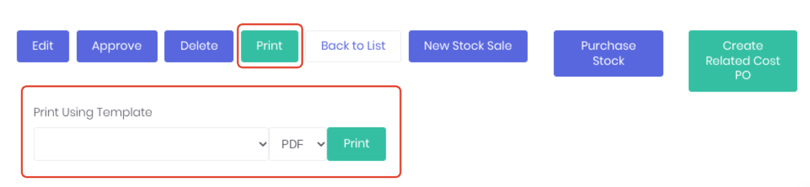 Once you have created the stock sale document templates, you can access them from the print dropdown at the bottom of the stock sale detail page. Select Print and select the required template from the dropdown prompt. Select the format required (PDF or DOCX) and Print.