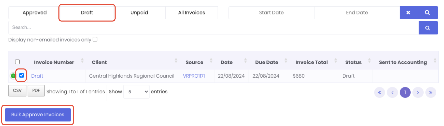 The Draft tab allows you to select invoices to bulk approve centrally. This is useful administratively if your workflow only allows staff to raise draft invoices, but are checked and approved by a manager or financial team.