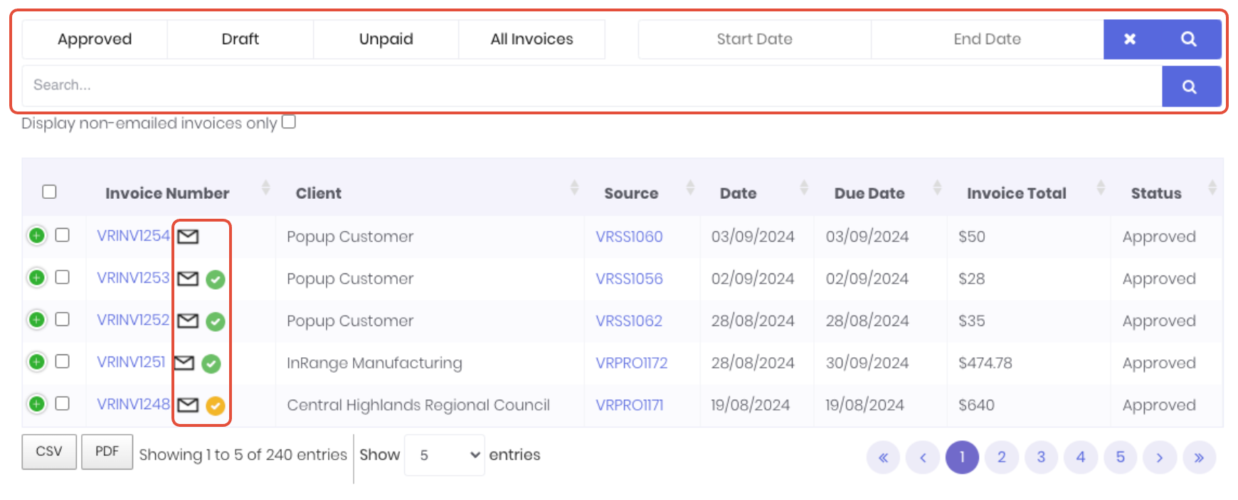 The invoice dashboard will also indicate the payment and sent status of individual invoices. Fully paid invoices are denoted with a green tick and partially paid via an orange tick. Invoices that have been successfully emailed to the client via WorkGuru will be displayed with an envelope icon.