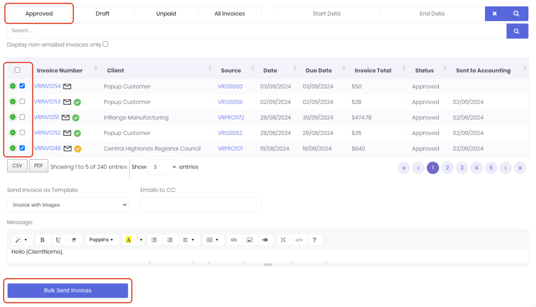The Approved and Unpaid tabs allow you to select invoices to bulk email invoices out to clients as a batch. The difference between the tabs being the default email template, with each tabs using the relevant invoice or unpaid invoice default email templates.