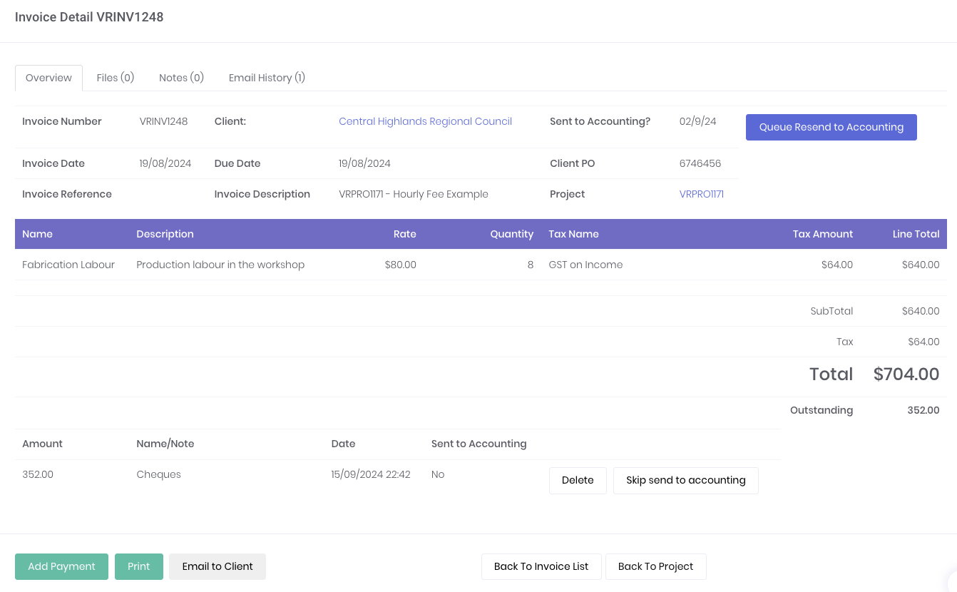 - Back to Project - Display the project detail page of the project the invoice was raised.