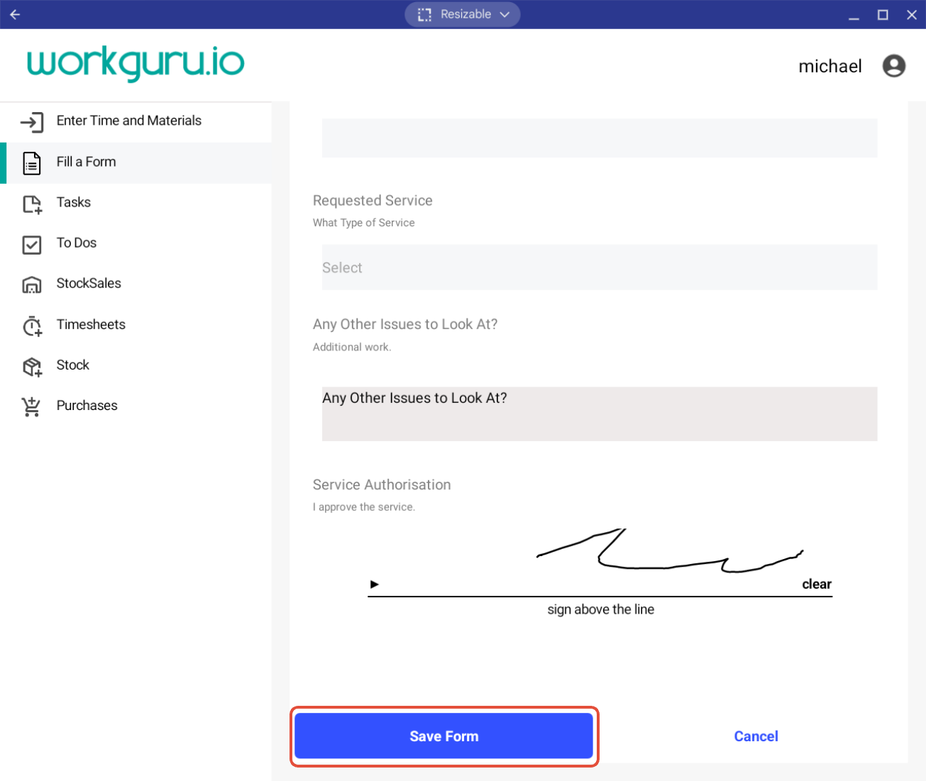 If your project workflow includes forms, staff can fill these in using the Kiosk app. Once signed in, tap Fill a Form to access the forms page.