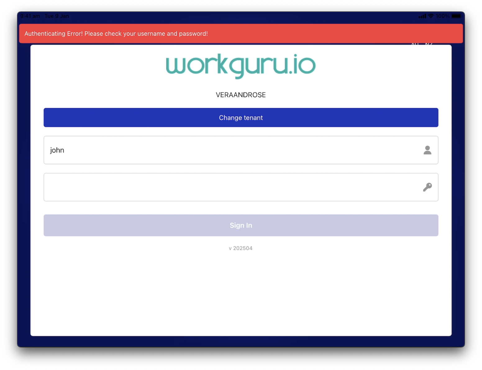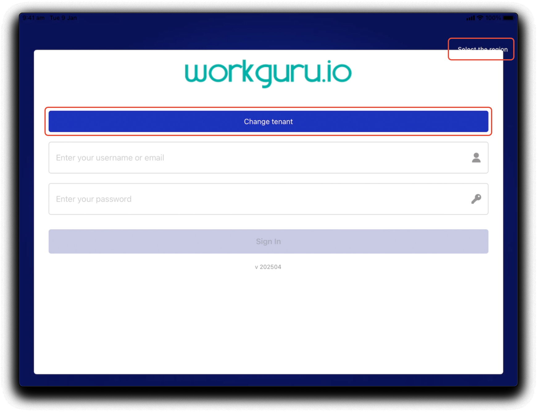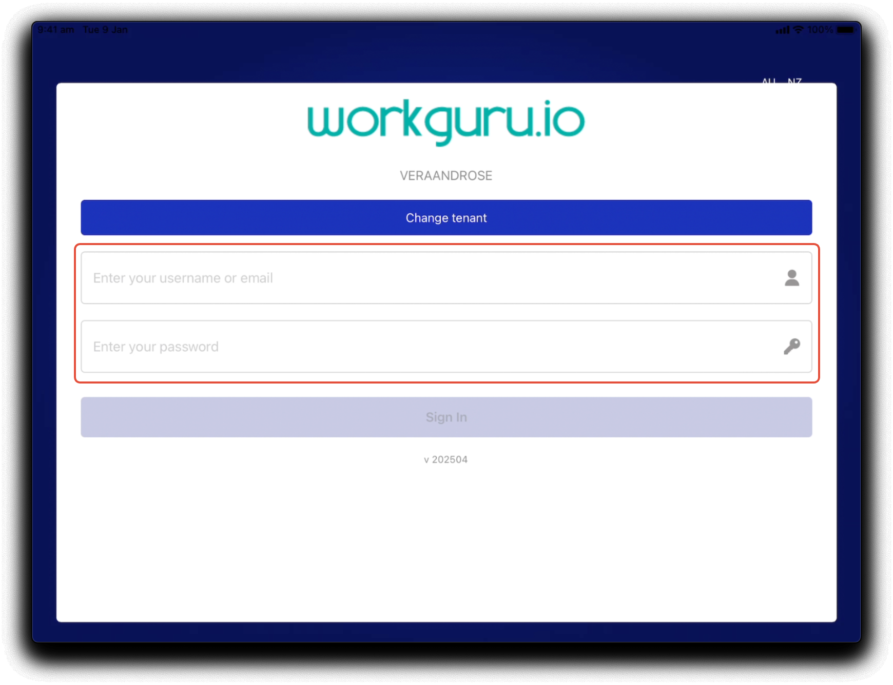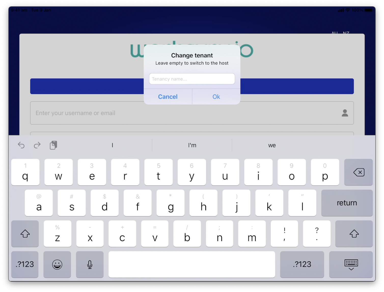 - Tenant - Tap Change Tenant and enter your current WorkGuru tenant name. Tap OK to apply. The current tenant will display above the change tenant button when selected. Note: If you don't know your tenant name, it is available in the top right hand corner before your account name if you have access to the web interface, or ask your WorkGuru administrator.