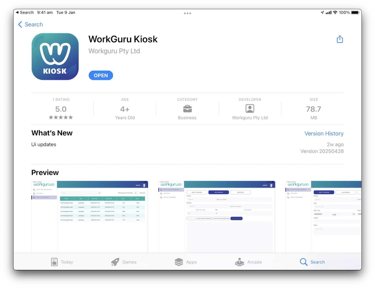 Setting up the WorkGuru Kiosk application on your iOS device is fast and easy. Search for WorkGuru Kiosk in the Apple App Store and install the application following your device's instructions. Note: Ensure you are downloading the Kiosk application and not the Mobile application (which is designed for personal devices)