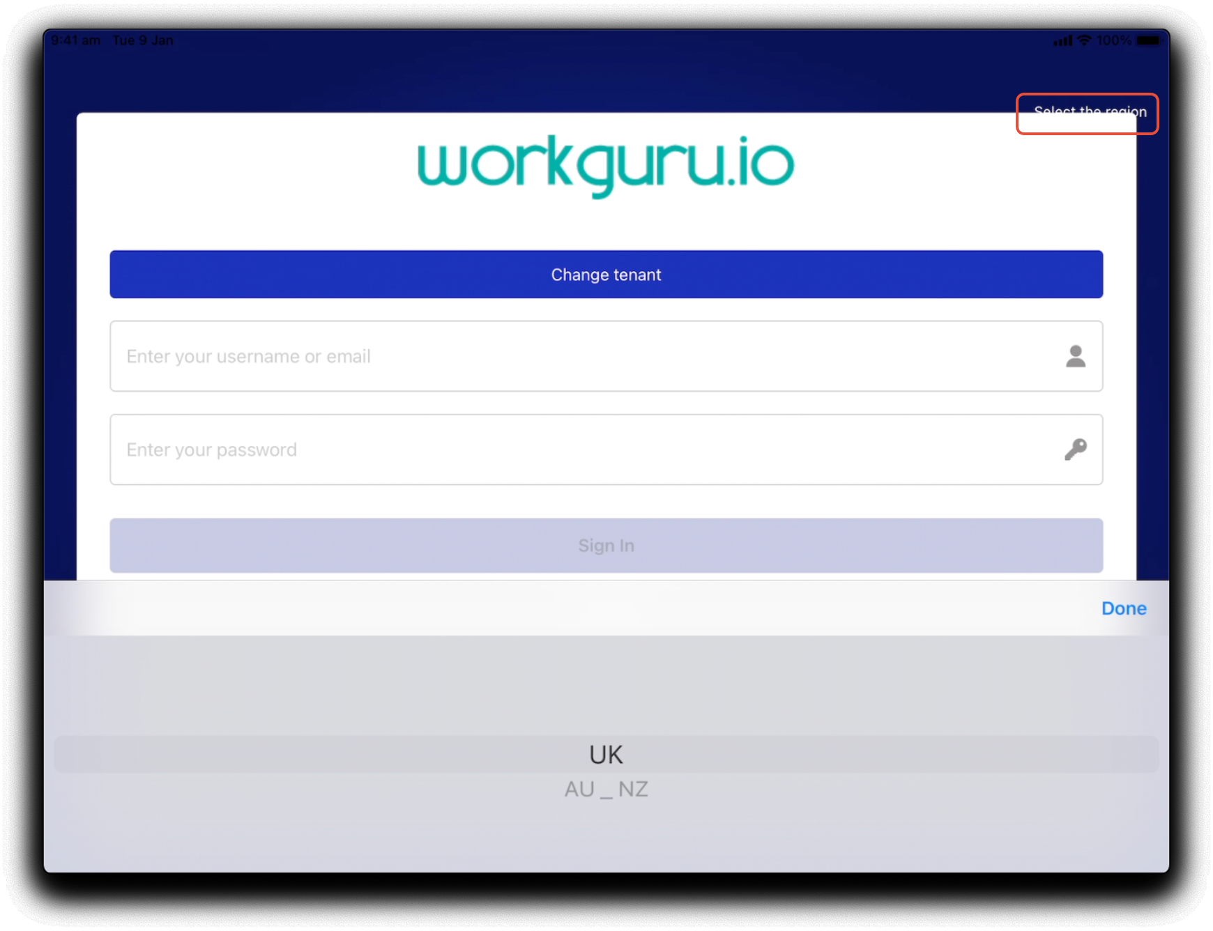 - Region - Check region matches your WorkGuru server (AU_NZ or UK).
