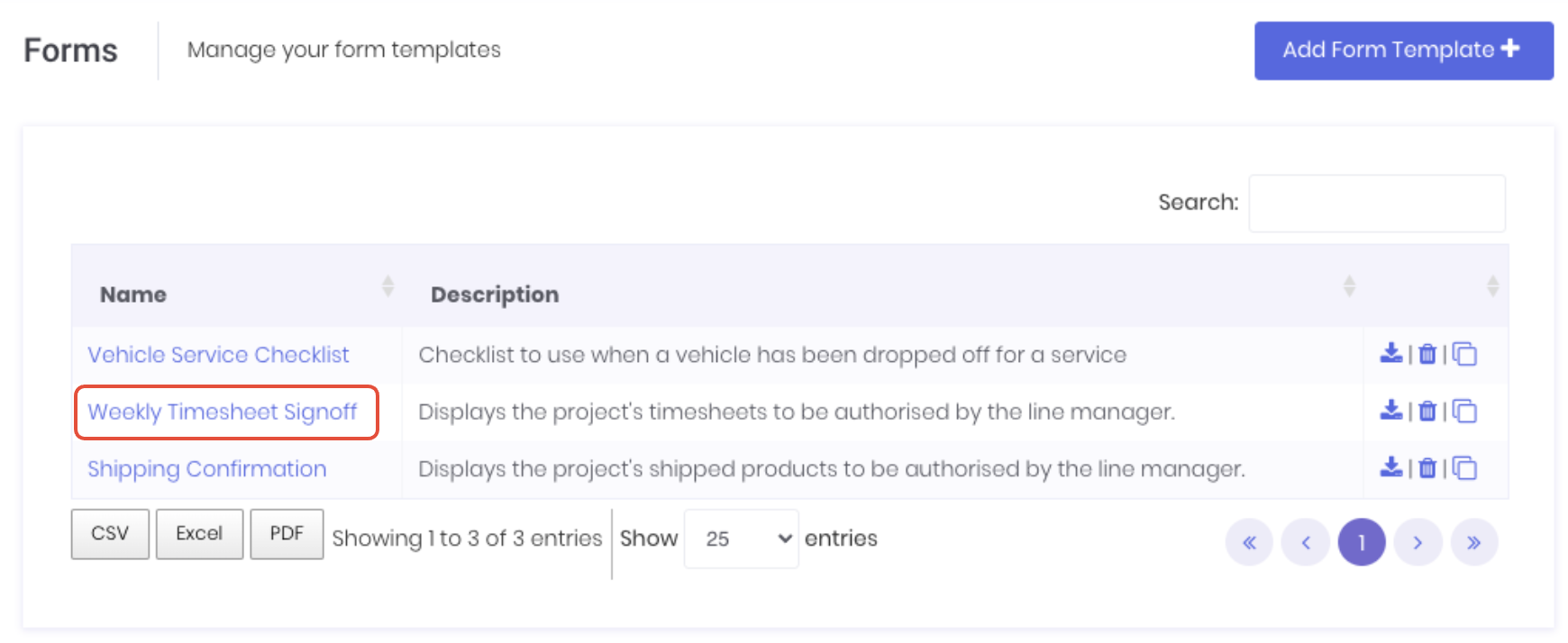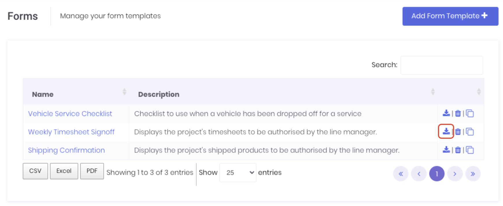 To update the form's document template, click on the form's download icon on the form template dashboard.