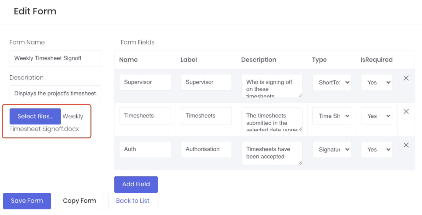 From the edit form template page, update the Form Name, Description and Form Fields as required. Click Add Field to create new form fields if required.