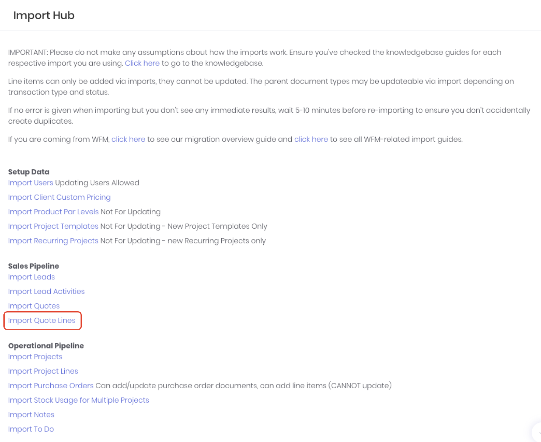 Quote lines allow you to populate existing quotes with task and product lines in bulk via a csv import template. You can upload lines to multiple quotes in the one quote line import. The import template can be uploaded on the Import Hub (Administration -> Imports).
