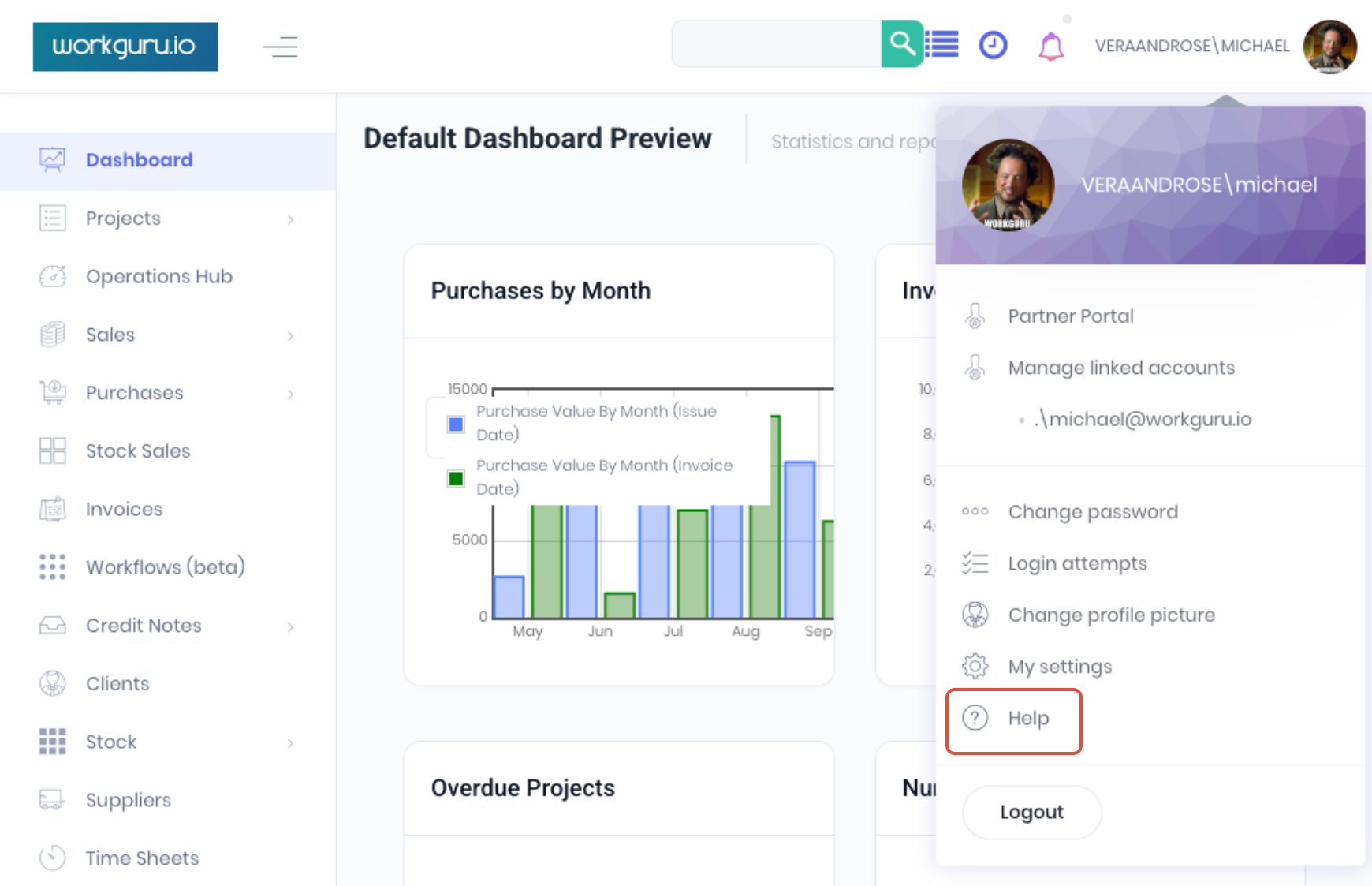 The help menu is a shortcut to the WorkGuru support portal (support.workguru.io).