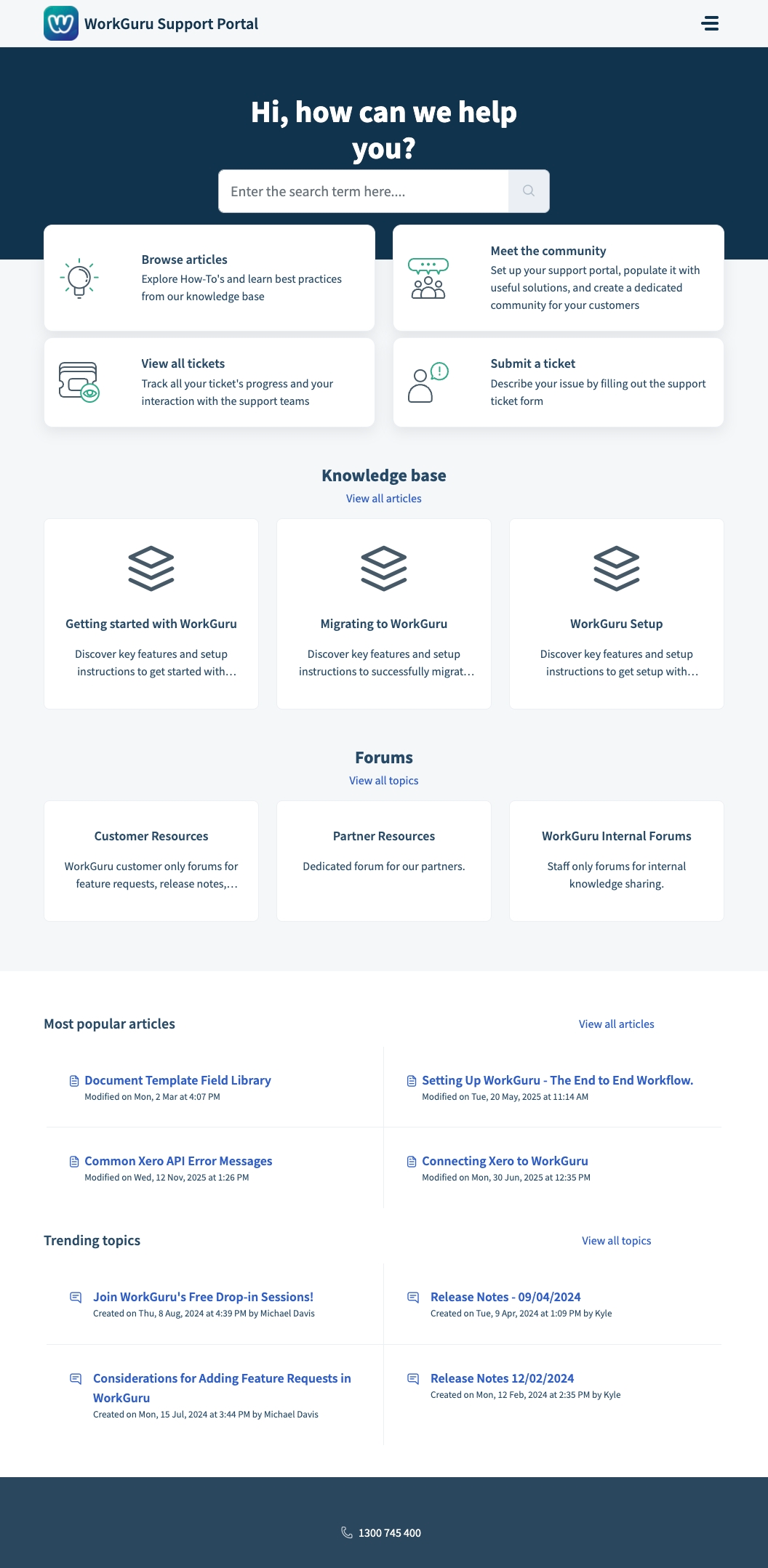 The support site contains support articles, resources and forums. If you need assistance with anything that isn't covered by the support portal, you can log a ticket by clicking New Support Ticket or send an email to support@workguru.io.