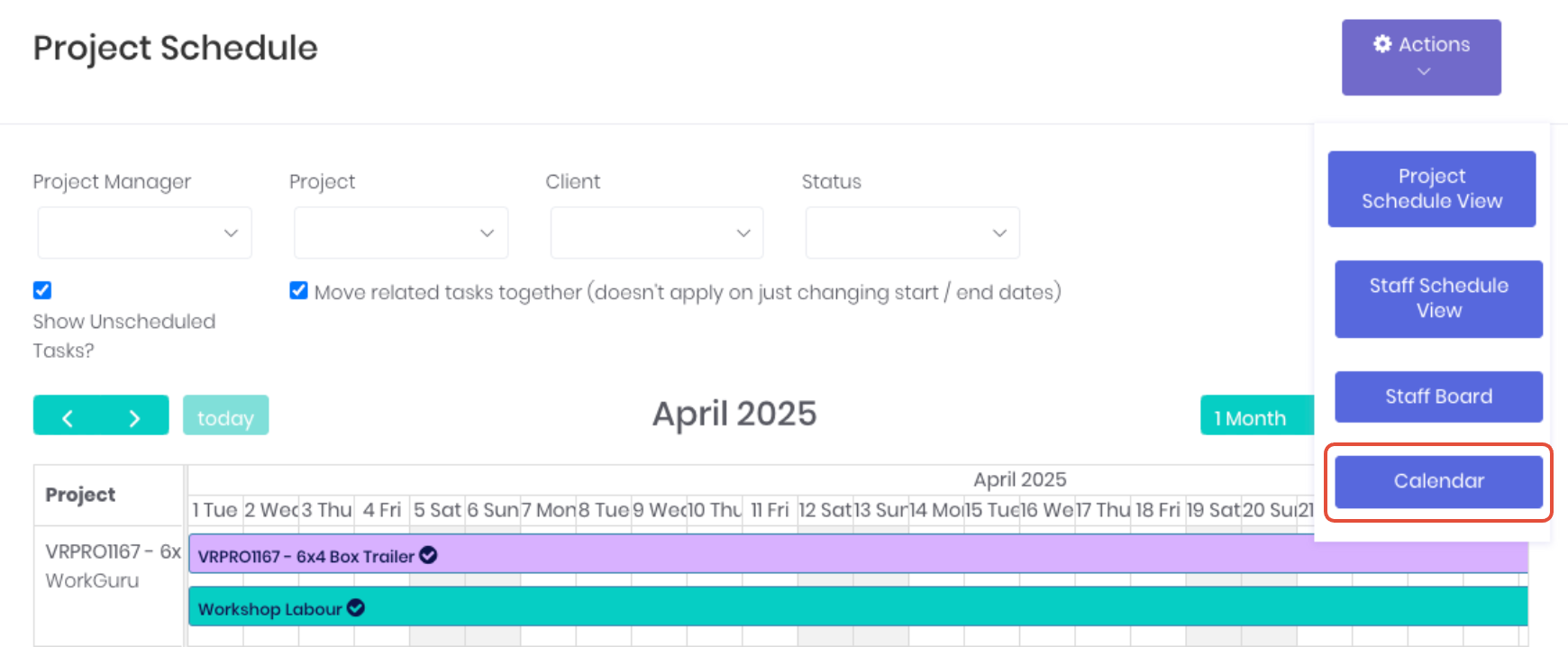 From the WorkGuru project schedule (Projects -> Gantt Chart) or staff schedule (Projects -> Staff Schedule) click the Actions dropdown and select Calendar.