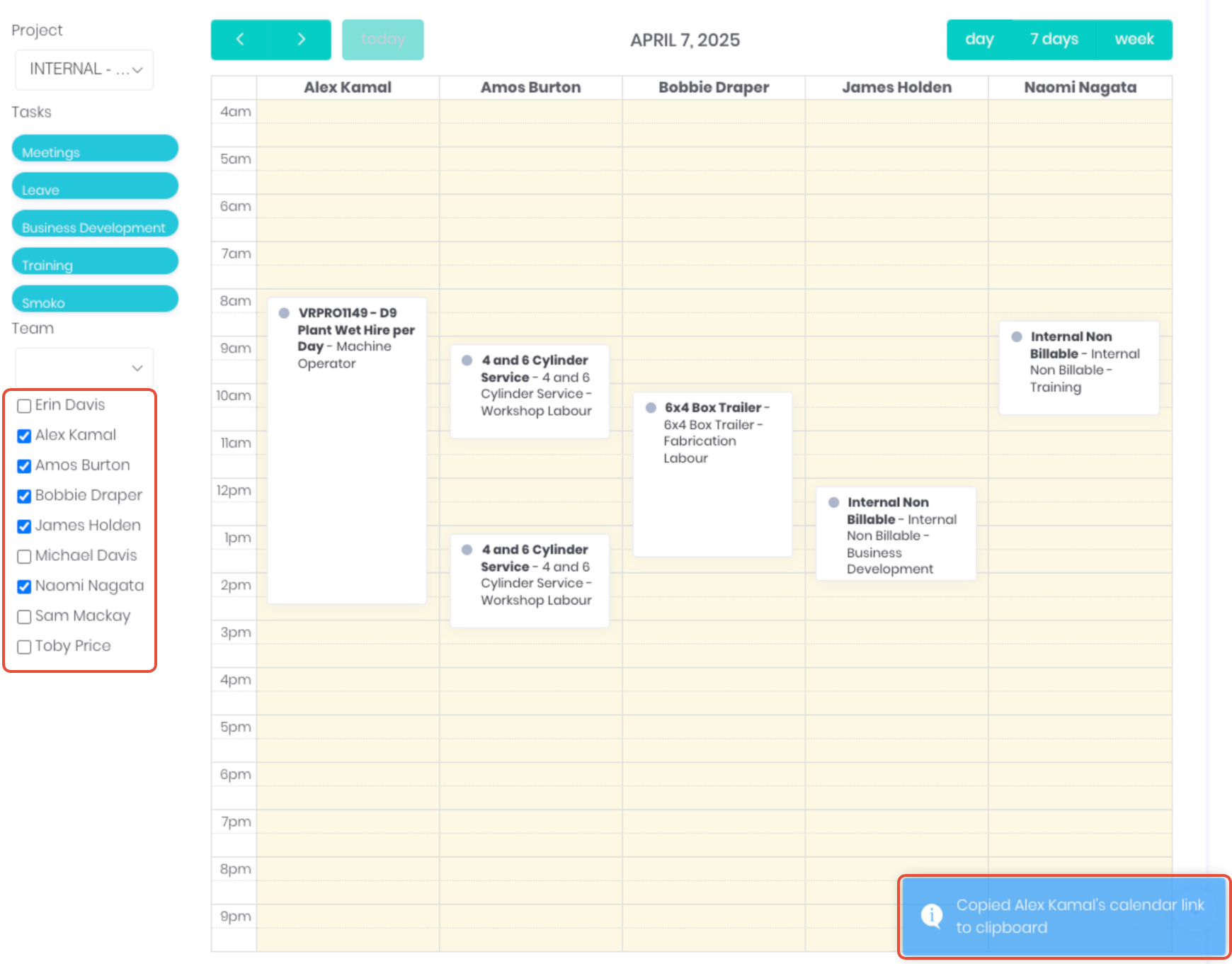 Select a Project from the dropdown to display the project's Tasks. Tasks can then drag and dropped to the schedule as required. Note: Tasks can be allocated to more than one staff member.