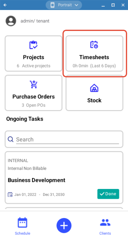 Staff can keep track of their timesheets on the go by tapping on the Timesheets tile to display a daily summary.