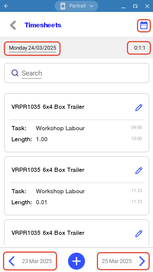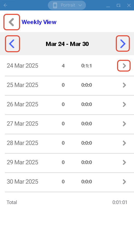 Tapping the calendar icon will display the weekly timesheet summary. The blue arrows will switch between the previous and following weeks. Each row in the weekly display will detail the date, number of timesheets and the totals (D:H:M), Tap the row arrow to display that day's timesheets. Tap the grey arrow to return to the current day.