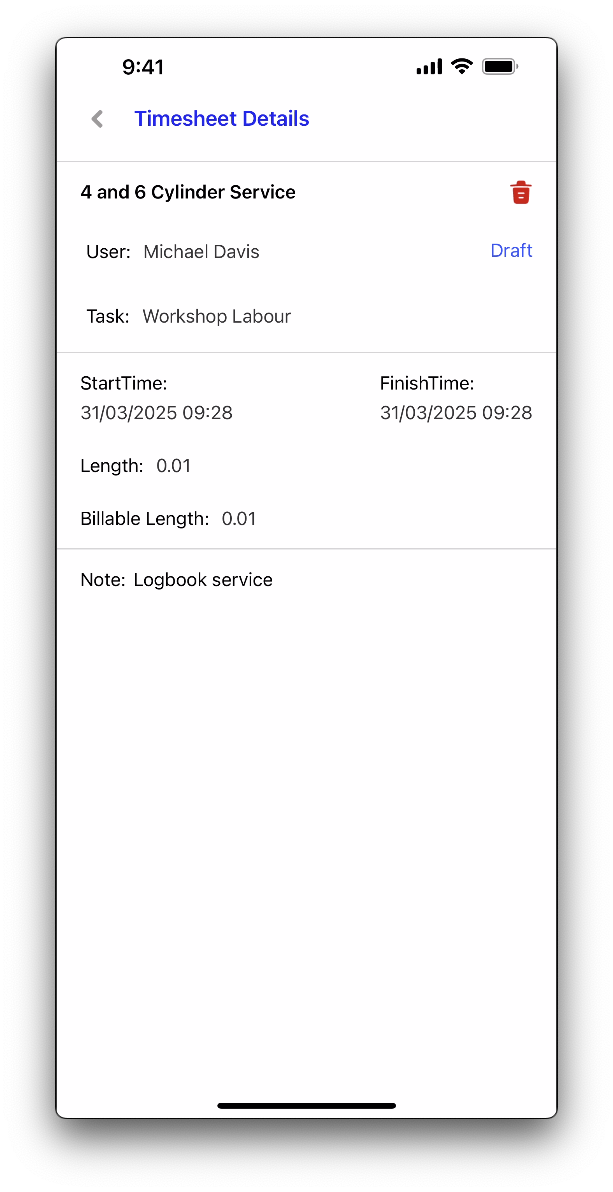 To remove a timesheet, open the timesheet details and tab on the red trash icon.