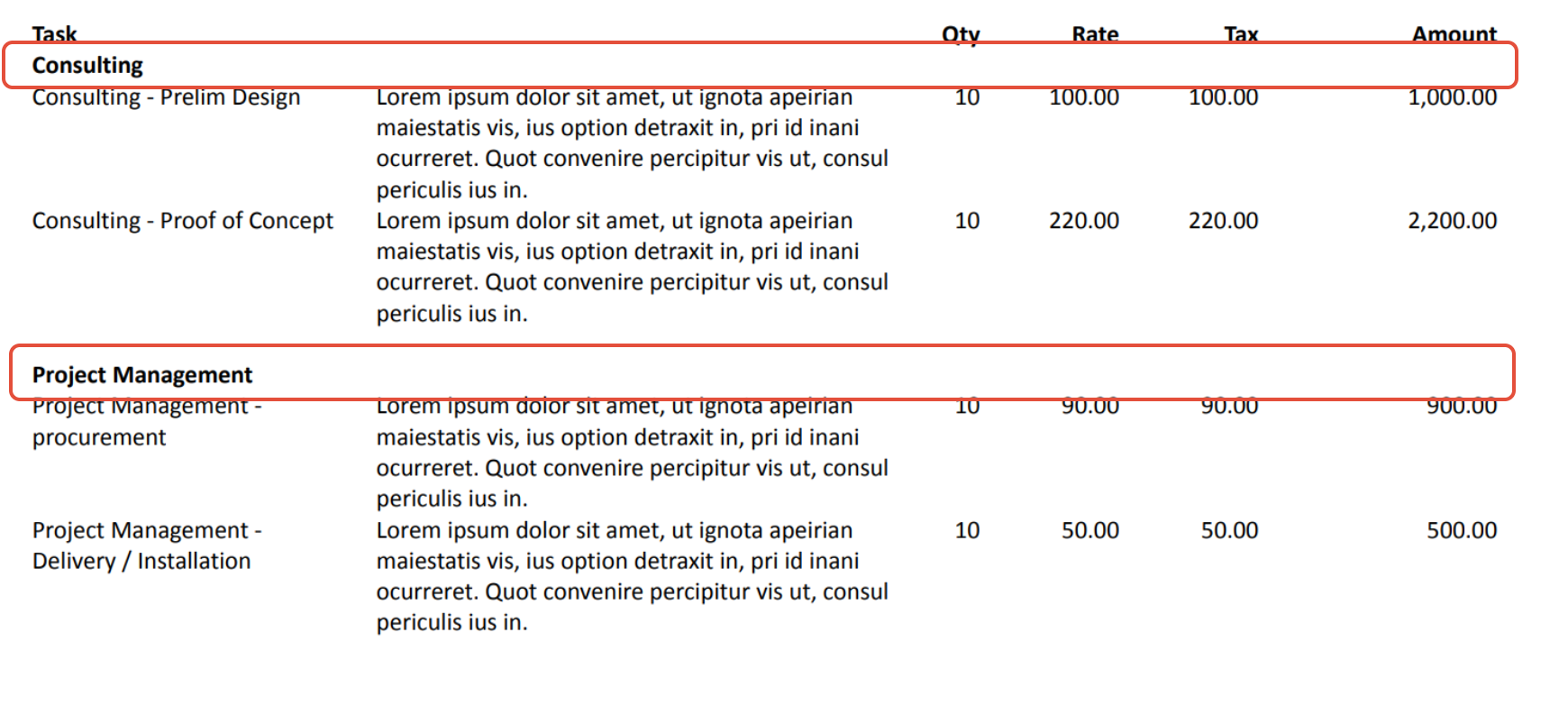Note: The header line can only display within the relevant table. If you need to group tasks and products together on a document template, use phases.