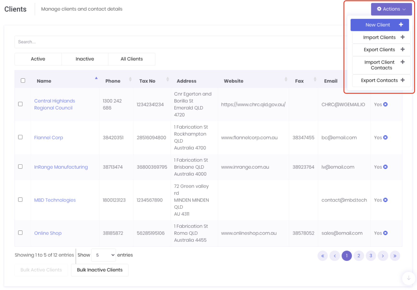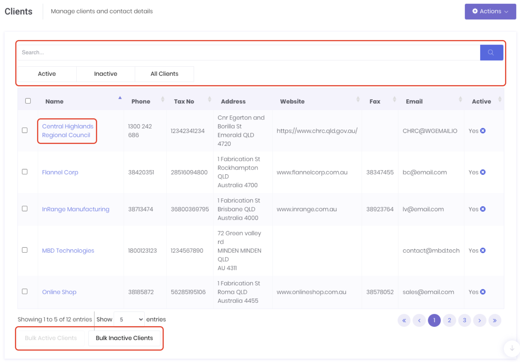 Search for any client info displayed on the dashboard and open the client detail page by clicking the client Name. Use the Active, Inactive or All Clients tabs to view/search specific lists of clients. Selecting the checkbox next to each client name in the Active or Inactive tabs will allow you to bulk Inactivate or Activate clients respectively.