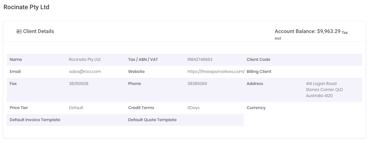 The Client Details section displays client information and current account balance in WorkGuru. Account Balance itself is made up of the balances of invoices without a payment applied to the full amount - this is not to be treated as a source of truth, as users should still be using their accounting software when it comes to returning financial information.