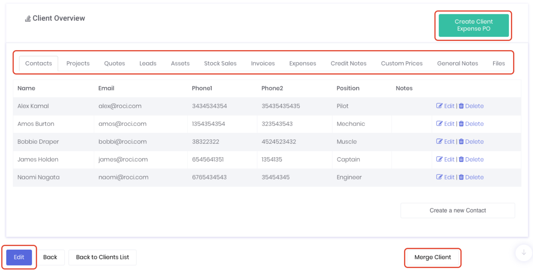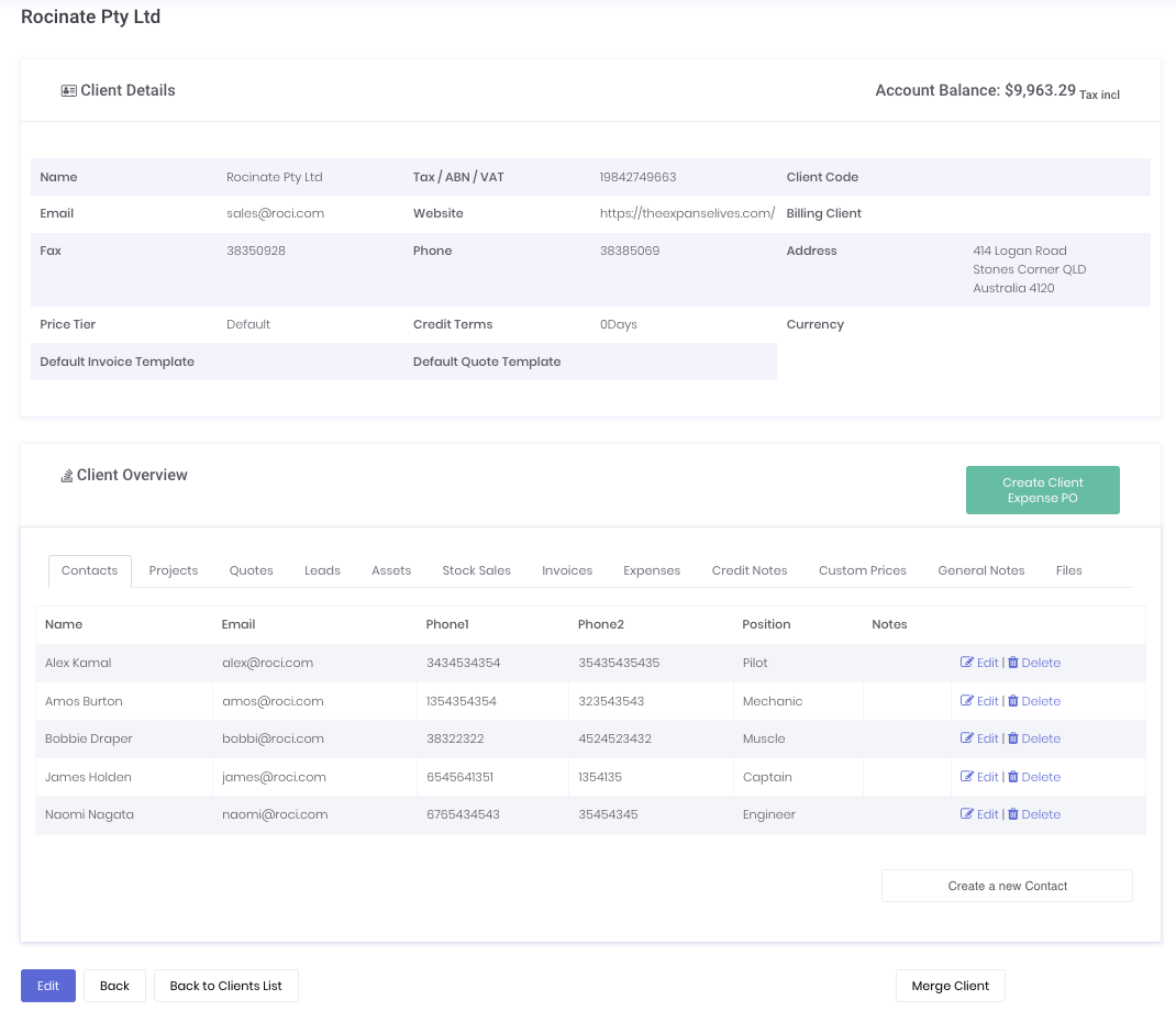 - Projects - Client project history, including a shortcut to Add a New Project pre-filled with the client details.