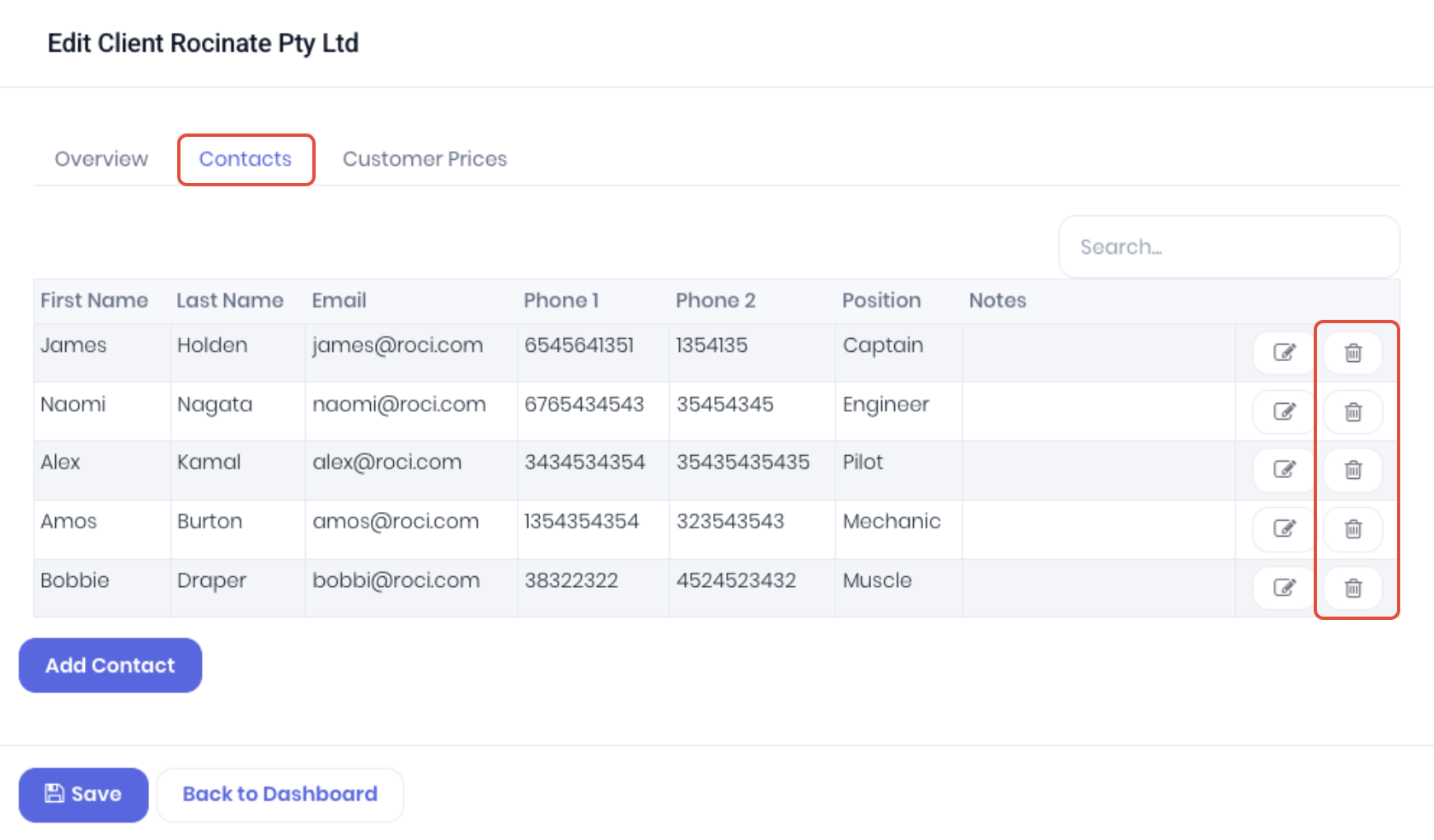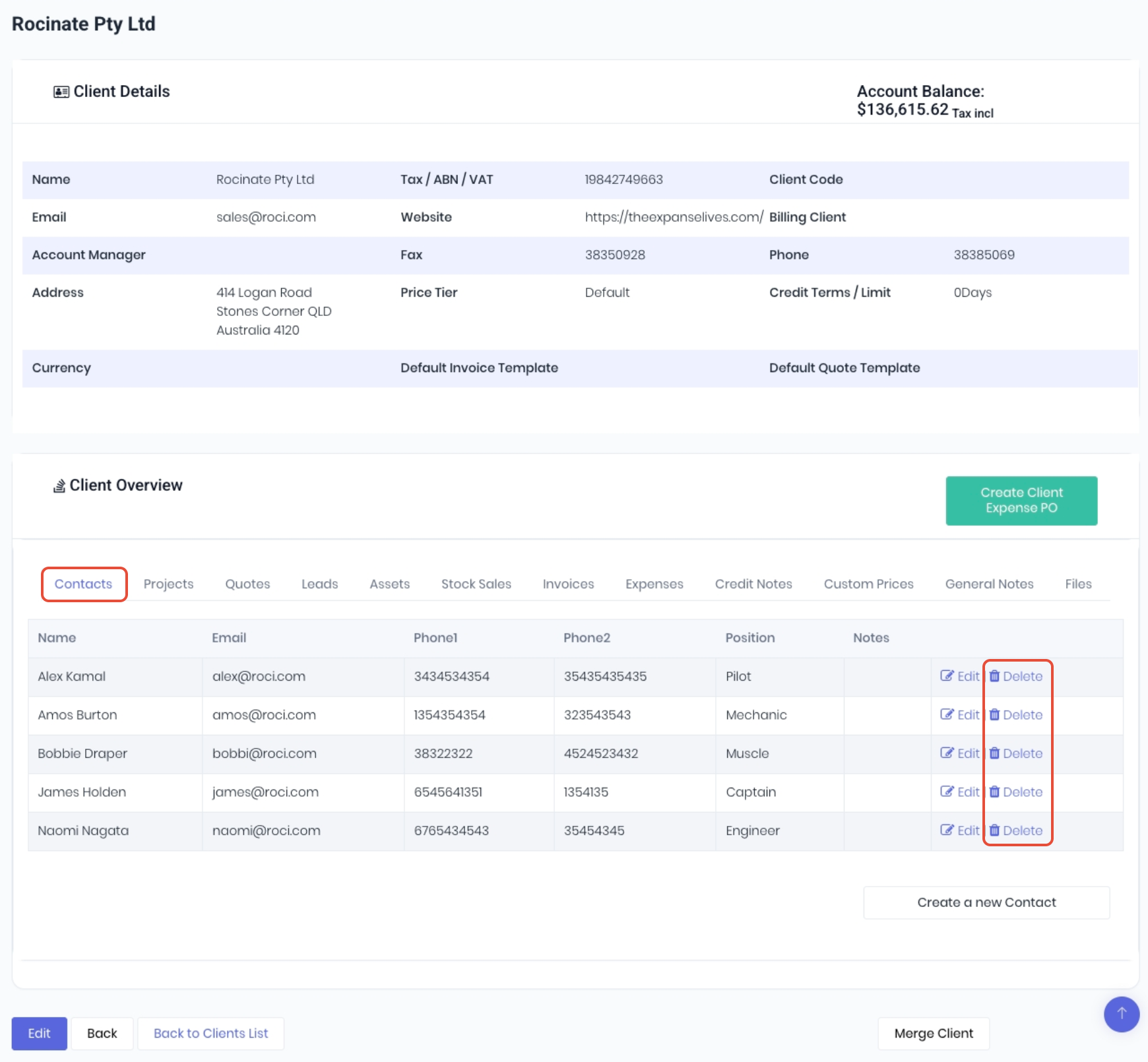 Or directly from the client detail page. In the Contacts tab of the Client Overview section, click Edit at the end of the contact row.