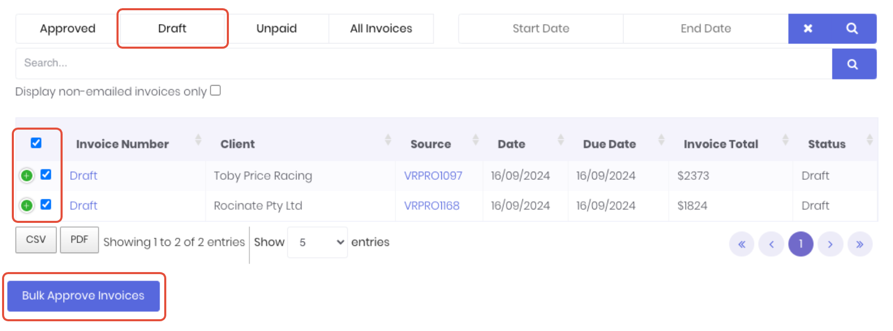 To bulk approve invoices, click on the Draft tab on the invoice dashboard. All invoices currently in the draft state will display. You can refine the results using the search and date fields as required.