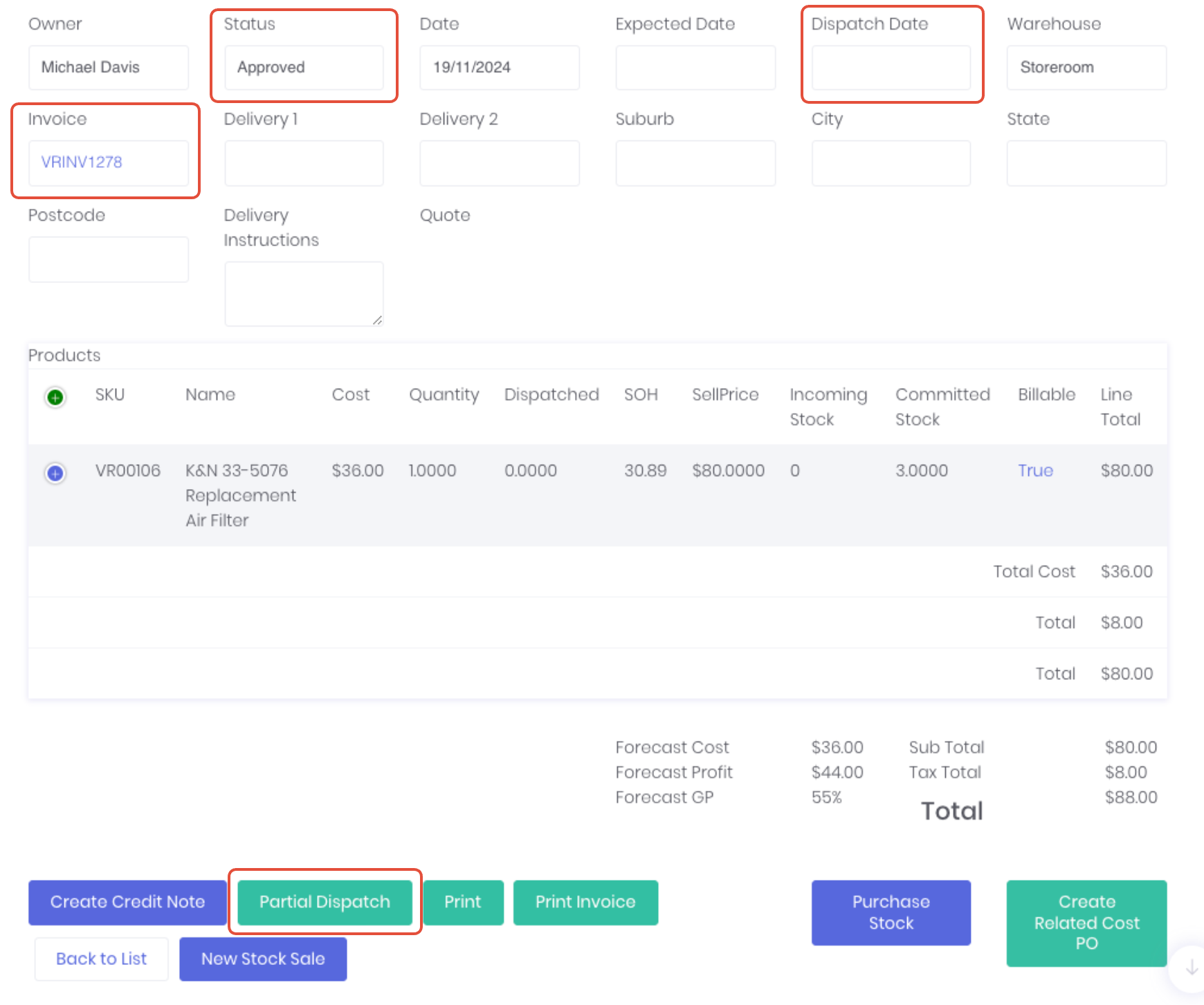If there is no other dispatches, the stock sale's status will revert from Dispatched back to Approved as it no longer has a dispatch date applied. To complete the sale again, you will need to fully or partially re-dispatch the products on the sale. Note: Reversing stock sale dispatches only affects the stock movement of the stock sale, it doesn't not impact the invoiced status. E.g: the sale will remain invoiced if one has been raised.