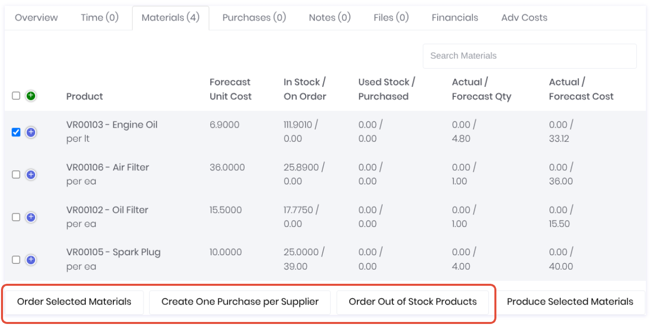 If your purchasing workflows are project specific, you can use the ordering functions available in the project's Materials tab to purchase forecast products with no data entry required: