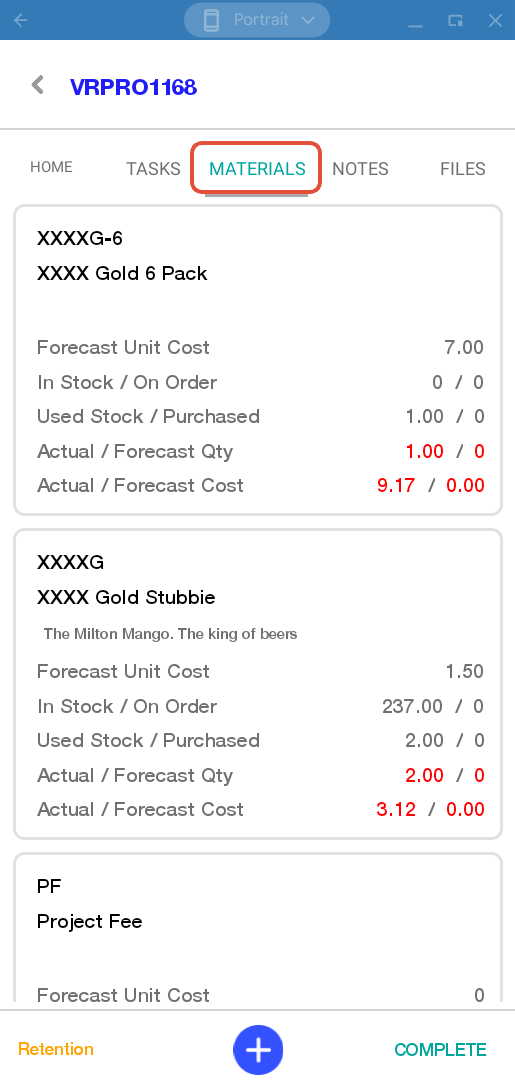 The materials will display the projects product line item details.