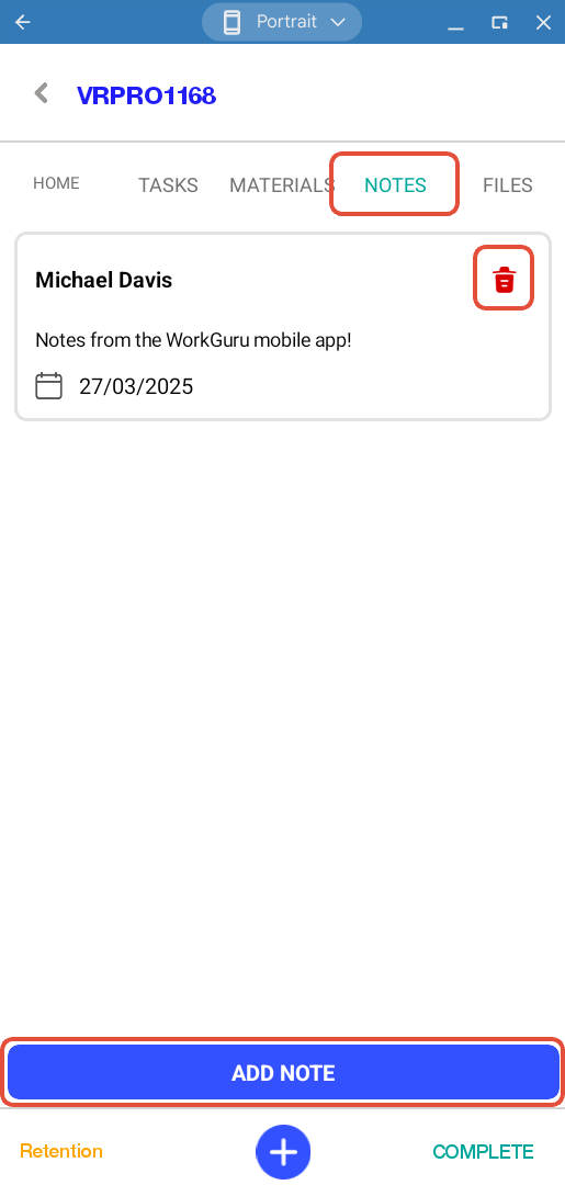 The notes tab allows easy access to review or add the project notes.