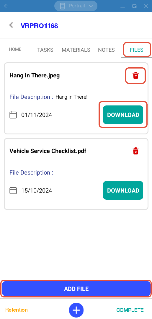 - Task completion - tap MARK TASK AS COMPLETED/INCOMPLETED to set task status. When completed the completed date will display.
