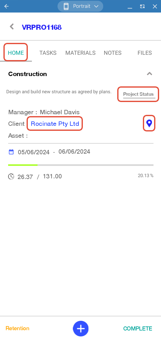 - Project location - Tap the geo pin to open the project client's address in the default map app.