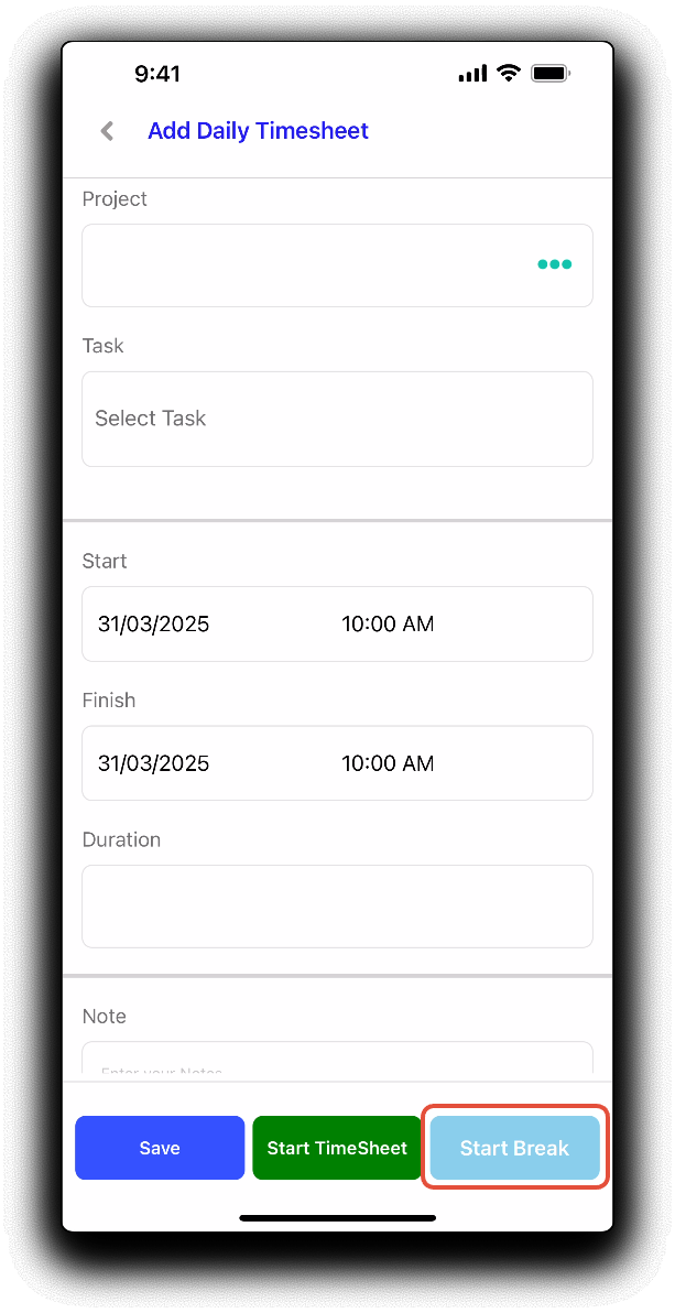 Tapping the Start Break button will immediately start a timesheet timer for the specified break task. This will then need to be stopped and saved when returning from the break and starting billable work again.