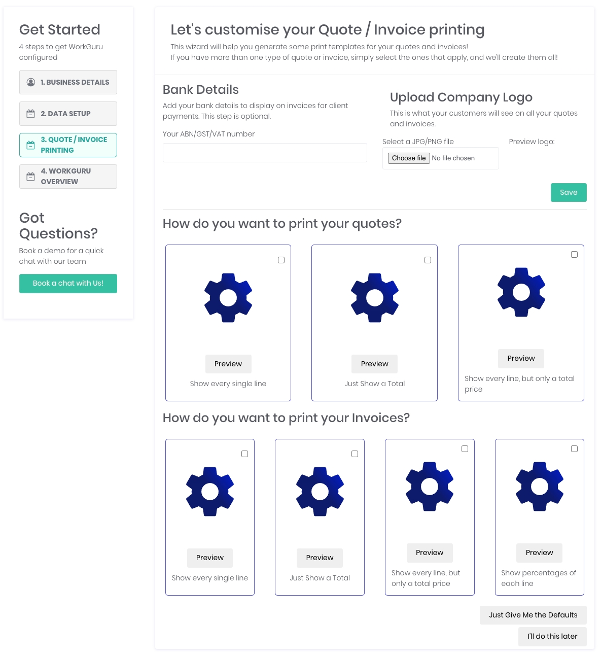 The onboarding tool will walk you through the 4 steps of setting up the basic data required to start using WorkGuru operationally.